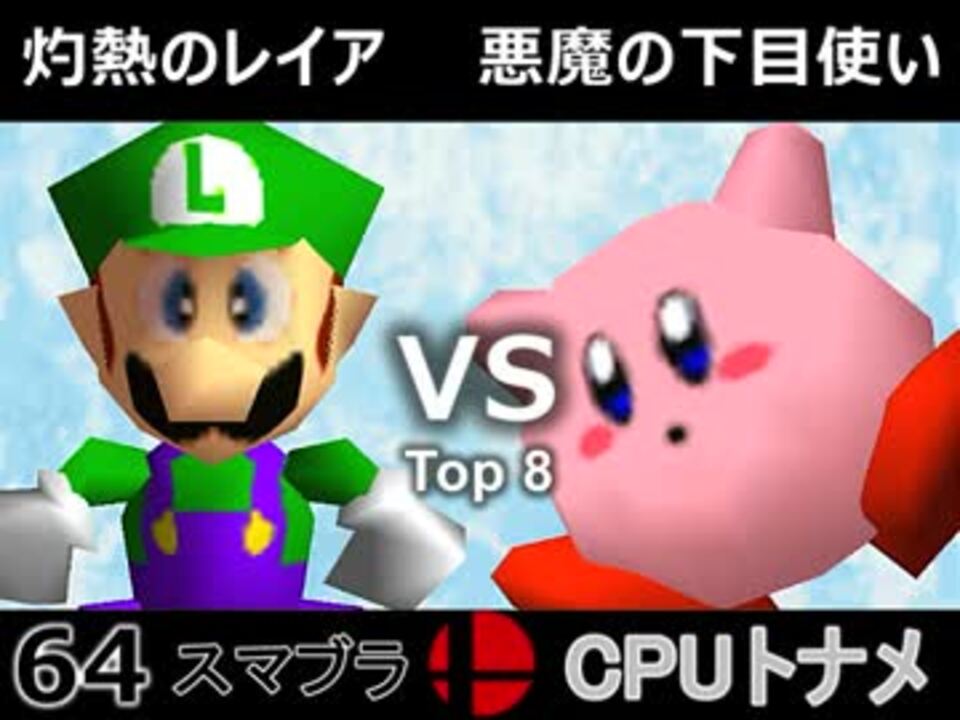 灼熱のレイア VS 悪魔の下目使い<br /><br /><b><font size="5"><font color="#ff0000">次→</font></font></b>【<a href="https://www.nicovideo.jp/watch/sm31104501" class="watch">sm31104501</a>】<br /><br />前【<a href="https://www.nicovideo.jp/watch/sm31093124" class="watch">sm31093124</a>】初戦【<a href="https://www.nicovideo.jp/watch/sm31072246" class="watch">sm31072246</a>】<br />第一回大会【<a href="https://www.nicovideo.jp/watch/sm23906204" class="watch">sm23906204</a>】<br />64スマブラリスト【<a href="https://www.nicovideo.jp/mylist/27365529" target="_blank" rel="noopener">mylist/27365529</a>】<br />その他シリーズ【<a href="https://www.nicovideo.jp/mylist/12965027" target="_blank" rel="noopener">mylist/12965027</a>】<br /><br /><b><font color="#00bfff">Twitter</font></b>【@niconicopppppp】<br /><b><font color="#ff0000">チャンネル</font></b>【<a href="https://ch.nicovideo.jp/p-desu" target="_blank" rel="noopener">ch.nicovideo.jp/p-desu</a>】<br /><b>コミュニティ</b>【co17681】