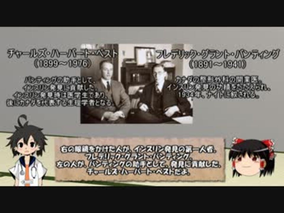 医学史シリーズ第4弾 <a href="https://www.nicovideo.jp/mylist/56912443" target="_blank" rel="noopener">mylist/56912443</a><br />インスリン製剤の歴史<br />6:30あたりまでは糖尿病やHbA1cについて解説。興味がないという方はシークバーをいじって飛ばしてください。<br />次→<a href="https://www.nicovideo.jp/watch/sm33139098" class="watch">sm33139098</a>(血の医療、瀉血・輸血の歴史)<br />前→<a href="https://www.nicovideo.jp/watch/sm30508042" class="watch">sm30508042</a>(ペニシリン発見の歴史)<br /><br />【簡易年表】<br />1869 膵臓ランゲルハンス島が発見される<br />1889 ミンコフスキーらにより膵臓と糖尿病の関連が示唆される<br />1921 バンティングとベストがインスリン抽出<br />1923 バンティングとマクラウドがノーベル医学賞を受賞<br />1958 サンガーがインスリンのアミノ酸配列を解明<br />1968 ホジキンがインスリンの立体構造を解明<br />1980s 遺伝子編集技術により、ヒトインスリンを量産できるように<br /><br />訂正 アレイチン×→アイレチン○ 申し訳ありません。