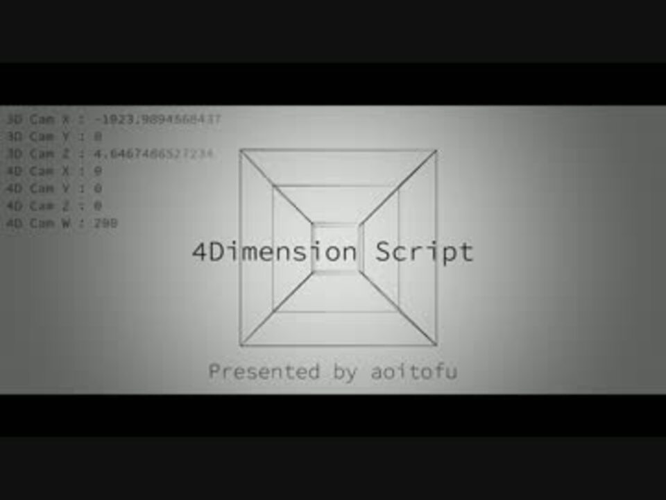 需要の低い物を作ってしまった。。。<br />4次元立方体を3次元に変換するスクリプトです。(AviUtlによって最終的に2次元になります。)<br /><br />DL : <a href="https://aoitofu.net/snippet/aviutl/" target="_blank" rel="noopener nofollow">https://aoitofu.net/snippet/aviutl/</a><br /><br />編集時に動作がおかしくなることがありますが、出力すれば普通になります。<br />多分バグあります。ごめんなさい。まじでごめんなさい。なんでもしm<br /><br />お借りした曲 : LostPlace4 <a href="http://peritune.com/lost_place4/" target="_blank" rel="noopener nofollow">http://peritune.com/lost_place4/</a>
