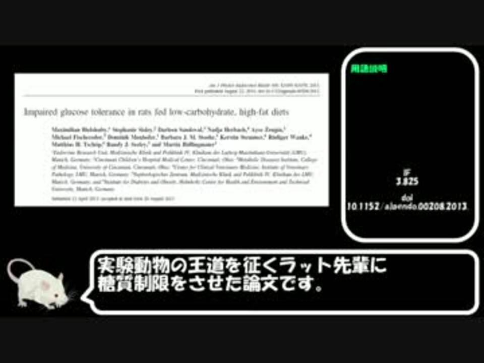 ネズミが変われば結果もかわる?!<br />広告誠にアリシャス!<br />2017年5/16,17,18,19,31,6/14,7/16<br /><br />Part1→<a href="https://www.nicovideo.jp/watch/sm31146956" class="watch">sm31146956</a><br />Part3→<a href="https://www.nicovideo.jp/watch/sm31256372" class="watch">sm31256372</a><br /><br />これまで作ったもの<br /><a href="https://www.nicovideo.jp/mylist/55689059" target="_blank" rel="noopener">mylist/55689059</a><br />低糖質ダイエットマイリスト<br /><a href="https://www.nicovideo.jp/mylist/58868486" target="_blank" rel="noopener">mylist/58868486</a><br /><br />ご意見、ご感想、ご要望などはこちらへ<br /><a href="https://twitter.com/lifesch_doc_P" target="_blank" rel="noopener nofollow">https://twitter.com/lifesch_doc_P</a><br /><br />お借りしたイラスト<br />© 2016 DBCLS 統合TV, licensed under Creative Commons Attribution 4.0 International license (CC-BY-4.0)<br /><a href="http://www.ac-illust.com/" target="_blank" rel="noopener nofollow">http://www.ac-illust.com/</a><br />お借りしたBGM<br /><a href="https://dova-s.jp/bgm/play4484.html" target="_blank" rel="noopener nofollow">https://dova-s.jp/bgm/play4484.html</a><br />引用論文doi<br />10.1152/ajpendo.00208.2013.