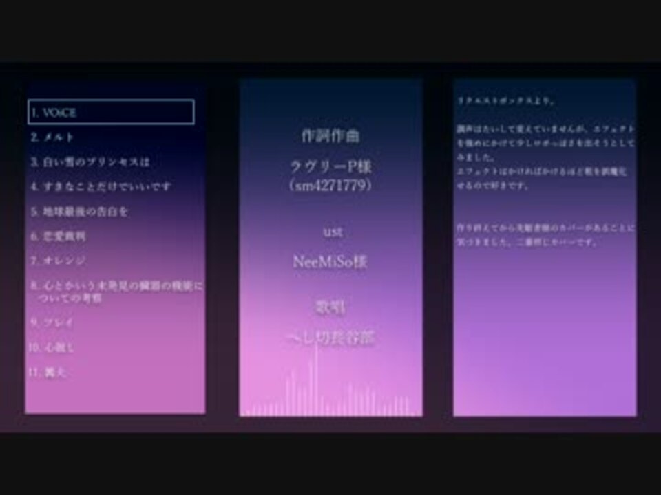 | 番号 | 総合順位 | ポイント | ジャンル順位 | カテゴリ | 再生順位 | 再生数 | コメント順位 | コメント数 | マイリスト順位 | マイリスト数 | いいね順位 | いいね数 |