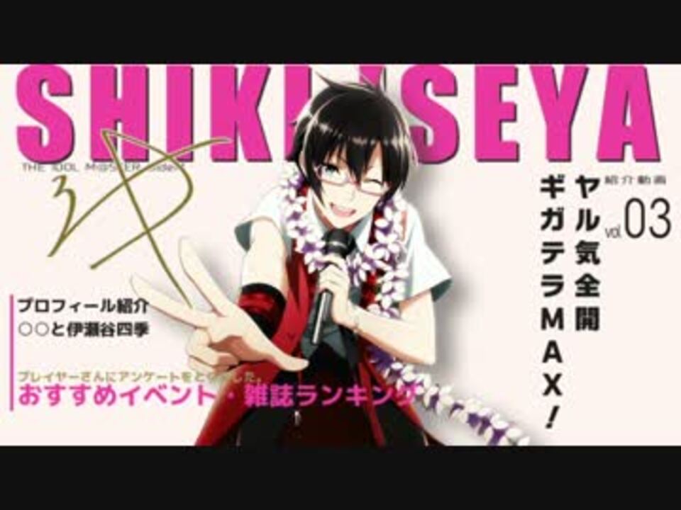 <font size="2"><a href="https://www.nicovideo.jp/watch/sm32590622" class="watch">sm32590622</a> <b>榊夏来</b>(High×Joker)<アイドル紹介動画リンク><b>東雲荘一郎</b>(Cafe Parade) <a href="https://www.nicovideo.jp/watch/sm32234692" class="watch">sm32234692</a><br /><br />SideMや伊瀬谷四季をもっと知りたい方向けに作りましたが、プレイ済みのプロデューサーさんにとってもアイドルの新たな魅力発見の一助になれば幸いです。<br />当動画はMobage版を元に作成しています。<br /><br />■所属ユニット:High×Joker[<a href="https://www.nicovideo.jp/watch/sm29227786" class="watch">sm29227786</a>]<br />■ユニットメンバー:秋山隼人[-]、冬美旬[-]、榊夏来[<a href="https://www.nicovideo.jp/watch/sm32590622" class="watch">sm32590622</a>]、若里春名[-]<br />--------------------<br />■アンケートの結果:<a href="https://drive.google.com/drive/folders/0Bx0o3UN57VMcMUdrNU5UYlhCT2c" target="_blank" rel="noopener nofollow">https://drive.google.com/drive/folders/0Bx0o3UN57VMcMUdrNU5UYlhCT2c</a><br />■アンケートの告知は<u>ブロマガ</u>で行っております→<a href="https://ch.nicovideo.jp/hye" target="_blank" rel="noopener">ch.nicovideo.jp/hye</a> <br />■ご協力いただいた皆様、ありがとうございました!<br /><br />■おまけ【<a href="https://www.nicovideo.jp/watch/sm31287508" class="watch">sm31287508</a>】(イベントカードまとめ)<br />■マイリスト【<a href="https://www.nicovideo.jp/mylist/55744376" target="_blank" rel="noopener">mylist/55744376</a>】<br /></font>