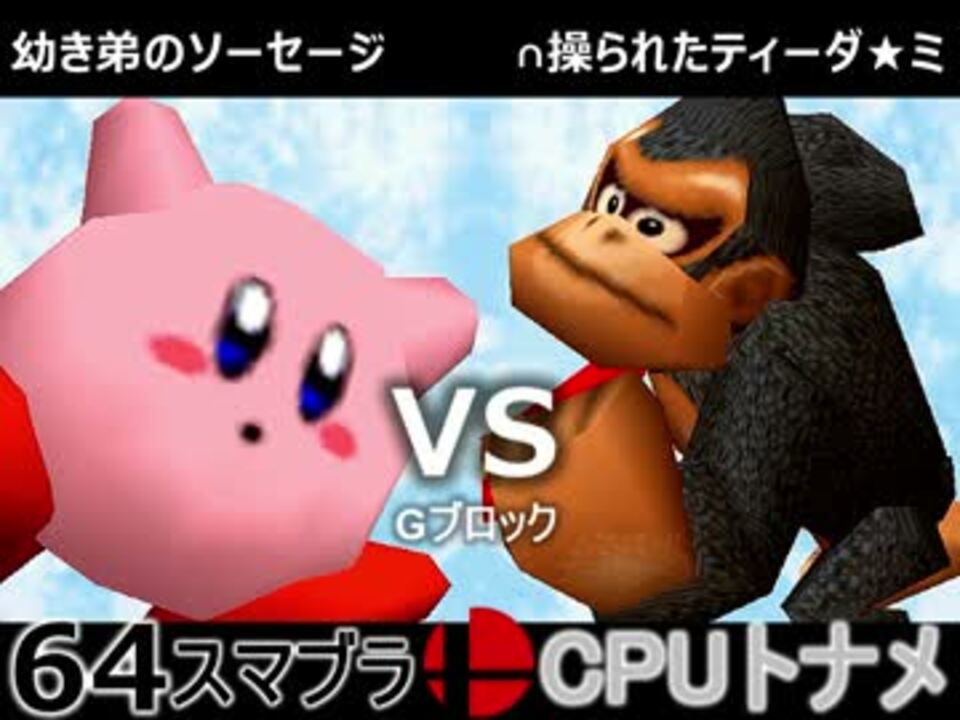 ヨシオくん(PU) VS 天空の虫使いアントン(YO)<br />幼き弟のソーセージ(KI) VS ∩操られたティーダ★ミ(DK)<br /><br /><b><font size="5"><font color="#ff0000">次→</font></font></b>【<a href="https://www.nicovideo.jp/watch/sm31298667" class="watch">sm31298667</a><br /><br />前【<a href="https://www.nicovideo.jp/watch/sm31287058" class="watch">sm31287058</a>】初戦【<a href="https://www.nicovideo.jp/watch/sm31228643" class="watch">sm31228643</a>】<br />第二回大会【<a href="https://www.nicovideo.jp/watch/sm31072246" class="watch">sm31072246</a>】<br />第一回大会【<a href="https://www.nicovideo.jp/watch/sm23906204" class="watch">sm23906204</a>】<br />64スマブラリスト【<a href="https://www.nicovideo.jp/mylist/27365529" target="_blank" rel="noopener">mylist/27365529</a>】<br />その他シリーズ【<a href="https://www.nicovideo.jp/mylist/12965027" target="_blank" rel="noopener">mylist/12965027</a>】<br /><br /><b><font color="#00bfff">Twitter</font></b>【@niconicopppppp】<br /><b><font color="#ff4500">チャンネル</font></b>【<a href="https://ch.nicovideo.jp/p-desu" target="_blank" rel="noopener">ch.nicovideo.jp/p-desu</a>】