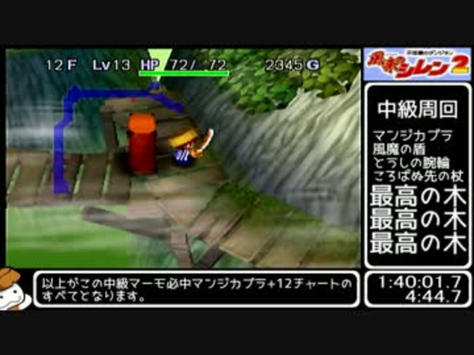 自己記録を大幅更新したので、ざっくりチャート解説。<br>計測区間は 名前入力後のムービー開始 ~ 親分撃破 まで<br><br>このパートだけで1時間40分進みますが、同じダンジョンを30周ほど<br>走り抜けるので倍速多めです。編集も頑張ってないですごめんなさい。<br>タイマーのみ付けた等速版:<a href="https://www.nicovideo.jp/watch/sm31166246" class="watch">sm31166246</a><br><br>お次:<a href="https://www.nicovideo.jp/watch/sm31316753" class="watch">sm31316753</a><br>これまで作ったやつ:<a href="https://www.nicovideo.jp/mylist/59110718" target="_blank" rel="noopener">mylist/59110718</a><br> <br><span style="font-size: 10px;"> KIREEKさん、風来人Fさん、LPVさん、旅ガラスさん、erariさん、魅青さん、<br>Airwire productsさん kuzuさん、NNSさん、蘭堂さん、一瀬グレン、16歳の破滅さん<br>yamaiさん、neunさん、たねさん、ダイソーさん、かわはぎさん、アゼるさん、<br>エルマさん、太陽さん、☆白虎☆さん、smoooochさん、海心さん、碰菓子さん、いーぐれっとさん<br>広告ありがとうです!</span><br>