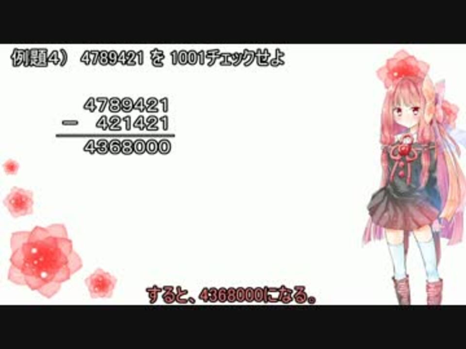 <br />アカネチャンカシコイヤッター<br /><br />前の動画が余りにも画質が悪かったので、上げ直し。<br />3や4の倍数判定方法は有名ですが、この動画では7や13の倍数判定方法を紹介します。<br />動画内で話している素数大富豪はこちら><a href="https://www.nicovideo.jp/watch/sm31102198" class="watch">sm31102198</a><br />他の投稿動画:<a href="https://www.nicovideo.jp/mylist/37722511" target="_blank" rel="noopener">mylist/37722511</a>