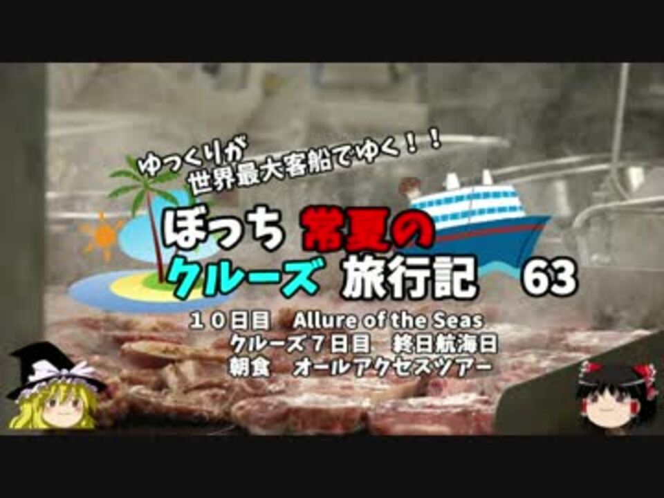 長かったようで短かったクルーズも、本日が実質の最終日<br />最後の最後まで楽しみましょう!<br />今回はお馴染みの朝日を拝んだあと朝食!<br />そのあとは船内探検ツアーです!!<br /><br />第一話→<a href="https://www.nicovideo.jp/watch/sm29940078" class="watch">sm29940078</a><br /><br />第1章・・・出発編<br />第2章・・・キーウエスト編<br />第3章・・・クルーズ前編<br />第4章・・・クルーズ後編<font color="red">←今ココ</font><br />第5章・・・FLD編<br />第6章・・・帰路編<br /><br /><font color="red">コミュ→co2910020</font><br />twitter→@ryontan<br /><br /><a href="https://www.nicovideo.jp/watch/sm31344551" class="watch">sm31344551</a>←前回 <font color="red">次回→64話<a href="https://www.nicovideo.jp/watch/sm31385824" class="watch">sm31385824</a></font><br /><br />今作 クルーズ旅行記→<a href="https://www.nicovideo.jp/mylist/57397685" target="_blank" rel="noopener">mylist/57397685</a><br />今作 車中泊旅行記→<a href="https://www.nicovideo.jp/mylist/54706524" target="_blank" rel="noopener">mylist/54706524</a><br />前作 ドイツ周遊記→<a href="https://www.nicovideo.jp/mylist/54938346" target="_blank" rel="noopener">mylist/54938346</a><br />前々作 北海道旅行記→<a href="https://www.nicovideo.jp/mylist/52618057" target="_blank" rel="noopener">mylist/52618057</a><br />前前々作 アメリカ横断記→<a href="https://www.nicovideo.jp/mylist/48621785" target="_blank" rel="noopener">mylist/48621785</a><br />