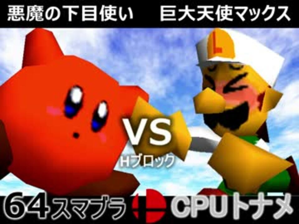 天使と悪魔<br /><br />悪魔の下目使い(KI) VS 巨大天使マックス(LU)<br />3億ドルの吐き気(FA) VS 昼間の召喚士(MA)<br /><br /><b><font size="5"><font color="#ff0000">次→</font></font></b>【<a href="https://www.nicovideo.jp/watch/sm31405247" class="watch">sm31405247</a>】<br /><br />前【<a href="https://www.nicovideo.jp/watch/sm31389187" class="watch">sm31389187</a>】初戦【<a href="https://www.nicovideo.jp/watch/sm31228643" class="watch">sm31228643</a>】<br />第二回大会【<a href="https://www.nicovideo.jp/watch/sm31072246" class="watch">sm31072246</a>】<br />第一回大会【<a href="https://www.nicovideo.jp/watch/sm23906204" class="watch">sm23906204</a>】<br />64スマブラリスト【<a href="https://www.nicovideo.jp/mylist/27365529" target="_blank" rel="noopener">mylist/27365529</a>】<br />その他シリーズ【<a href="https://www.nicovideo.jp/mylist/12965027" target="_blank" rel="noopener">mylist/12965027</a>】<br /><br /><b><font color="#00bfff">Twitter</font></b>【@niconicopppppp】<br /><b><font color="#ff4500">チャンネル</font></b>【<a href="https://ch.nicovideo.jp/p-desu" target="_blank" rel="noopener">ch.nicovideo.jp/p-desu</a>】