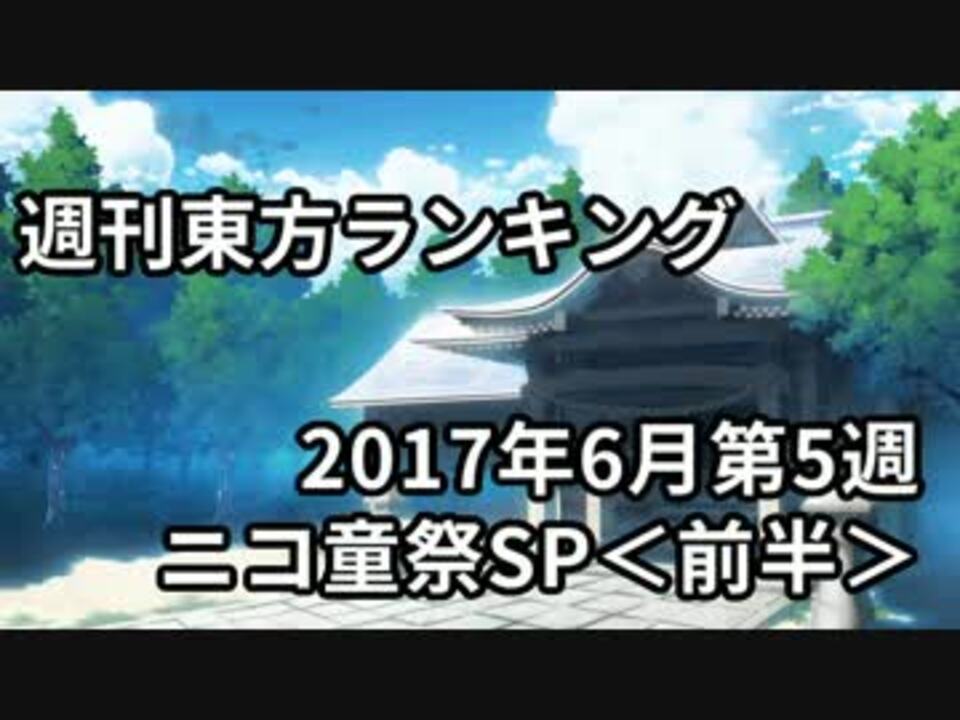 いよいよニコ童祭SPです!<br />前半:100~51位、編集担当のピックアップ<br />後半:50位~1位、集計担当のピックアップ<br /><br />「週刊東方ランキングED絵」および、アイキャッチ用のイラストを「東方動画イラスト支援」タグで募集中!詳細は大百科を!<br />■2017年06月22日(木) 05:00~2017年06月29日(木) 05:00<br /><br />■プレイリスト<br /> 前半[<a href="http://nico.ms/dic/5494850]" target="_blank" rel="noopener nofollow">http://nico.ms/dic/5494850]</a><br /> 後半[<a href="http://nico.ms/dic/5494855]" target="_blank" rel="noopener nofollow">http://nico.ms/dic/5494855]</a><br />■エンドカード old_moon様 (<a href="https://seiga.nicovideo.jp/seiga/im6788165" target="_blank" rel="noopener">im6788165</a>)<br />■エンディング曲 R-G様 (<a href="https://www.nicovideo.jp/watch/sm31431746" class="watch">sm31431746</a>)<br /><br />■コミュニティ [co1671378]<br /><br />後半:通常版[<a href="https://www.nicovideo.jp/watch/sm31504008" class="watch">sm31504008</a>] ネタバレ防止版[<a href="https://www.nicovideo.jp/watch/sm31505853" class="watch">sm31505853</a>]<br />[<a href="https://www.nicovideo.jp/watch/sm31450286" class="watch">sm31450286</a>]←先週 次週→[<a href="https://www.nicovideo.jp/watch/sm31550415" class="watch">sm31550415</a>]