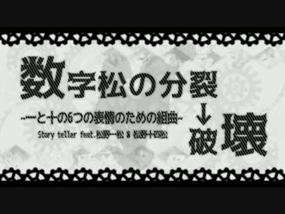 <b><font color="purple">一</font>のために<font color="yellow">十</font>を捨てるのが法則--------</b><br /> <br /> 絵師7名、人力師13名、MIX師1名、動画師1名(兼任有)の総勢20名による合作です。<br /> 参加者様方、この度は参加して下さりありがとうございます・・・!この場をお借りして御礼申し上げます。<br /> お借りしたもの、参加者様は動画内にて紹介しています。<br /> <br /> ※冒頭の注意書きをよくお読みください<br /> ※無断転載禁止<br /> <br /> 主催:みう(@miusbms)【<a href="https://www.nicovideo.jp/mylist/56731511" target="_blank" rel="noopener">mylist/56731511</a>】<br /> 副主催:わに(@wakariaeruyo)【<a href="https://www.nicovideo.jp/mylist/55080708" target="_blank" rel="noopener">mylist/55080708</a>】<br /> <br /> 【訂正】<br /> 動画内記載名義に誤りがありました。 正しくは、<br /> Dark十四松→紫杏778@女紫松P<br /> Solid十四松→にぼしりP<br /> Light一松→神代。<br /> です。ご不快にさせてしまい申し訳ございませんでした。<br />