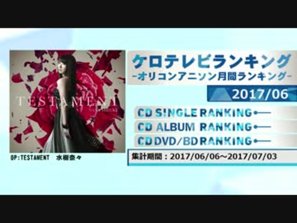 [HP]<a href="http://www20.atwiki.jp/keroro00innovator/" target="_blank" rel="noopener nofollow">http://www20.atwiki.jp/keroro00innovator/</a><br />デイリー:<a href="http://www20.atwiki.jp/keroro00innovator/pages/25.html" target="_blank" rel="noopener nofollow">http://www20.atwiki.jp/keroro00innovator/pages/25.html</a><br />週間:<a href="http://www20.atwiki.jp/keroro00innovator/pages/26.html" target="_blank" rel="noopener nofollow">http://www20.atwiki.jp/keroro00innovator/pages/26.html</a><br />2017年6月度のランキングです。<br />基本的にアニメソングのみ。除外基準:<a href="http://www20.atwiki.jp/keroro00innovator/pages/4.html" target="_blank" rel="noopener nofollow">http://www20.atwiki.jp/keroro00innovator/pages/4.html</a><br />5月:<a href="https://www.nicovideo.jp/watch/sm31350169" class="watch">sm31350169</a> 7月:<a href="https://www.nicovideo.jp/watch/sm31672873" class="watch">sm31672873</a> ランキング一覧:<a href="https://www.nicovideo.jp/mylist/47656494" target="_blank" rel="noopener">mylist/47656494</a>