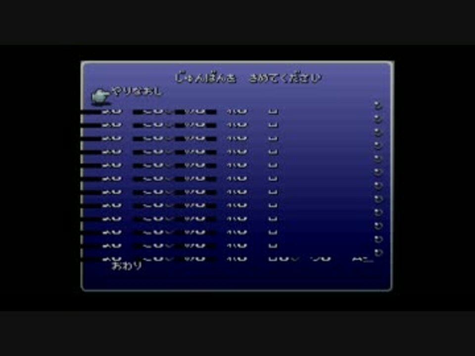 忙しくて歩くヒマもない人のためのFF6<br />52回全滅バグとロード画面でのタイマー再作動現象を利用しています<br />忙しい人のためとはいえ無編集なので40分はかかるのはご容赦<br /><br />FF6はタイマーを一度に4つまでセットできるのでフル活用してみました<br />全滅バグで実行したコマンドは下記の通り<br /><br />A0 00 10 60 5B 38(タイマー2:魔大陸)<br />A0 00 20 7E 57 30(タイマー0:世界崩壊)<br />A0 00 40 51 BF 36(タイマー1:ティナ暴走)<br />A0 00 60 7D 05 3C(タイマー3:ラストバトル)<br /><br />世界崩壊でメンバーが離脱するため、直後にティナ暴走イベントを行うことでセリスとエドガーを補填しています