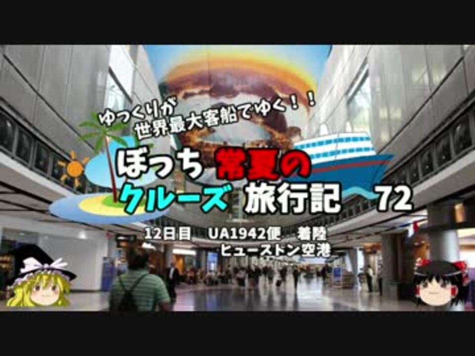引き続き帰路の模様をお伝えします。<br />今回はネタも何もなく、飛行機からの眺めとヒューストン空港の様子だけです。<br />いよいよ最終回へのカウントダウンが近づいてきました・・・<br /><br />第一話→<a href="https://www.nicovideo.jp/watch/sm29940078" class="watch">sm29940078</a><br /><br />第1章・・・出発編<br />第2章・・・キーウエスト編<br />第3章・・・クルーズ前編<br />第4章・・・クルーズ後編<br />第5章・・・FLD編<br />第6章・・・帰路編<font color="red">←今ココ</font><br /><br /><font color="red">コミュ→co2910020</font><br />twitter→@ryontan<br /><br /><a href="https://www.nicovideo.jp/watch/sm31532034" class="watch">sm31532034</a>←前回 <font color="red">次回→73話<a href="https://www.nicovideo.jp/watch/sm31568398" class="watch">sm31568398</a></font><br /><br />今作 クルーズ旅行記→<a href="https://www.nicovideo.jp/mylist/57397685" target="_blank" rel="noopener">mylist/57397685</a><br />今作 車中泊旅行記→<a href="https://www.nicovideo.jp/mylist/54706524" target="_blank" rel="noopener">mylist/54706524</a><br />前作 ドイツ周遊記→<a href="https://www.nicovideo.jp/mylist/54938346" target="_blank" rel="noopener">mylist/54938346</a><br />前々作 北海道旅行記→<a href="https://www.nicovideo.jp/mylist/52618057" target="_blank" rel="noopener">mylist/52618057</a><br />前前々作 アメリカ横断記→<a href="https://www.nicovideo.jp/mylist/48621785" target="_blank" rel="noopener">mylist/48621785</a>