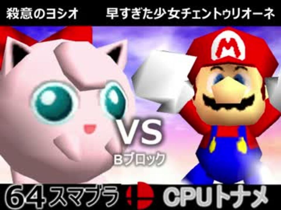 勝ったほうが進出、負けたほうが敗退<br /><br /><u>※どちらが勝つかアンケ結果(Twitter調べ)</u><br />殺意のヨシオ(PU)63% VS 早すぎた少女チェントゥリオーネ(MA)37%<br /><br /><b><font size="5"><font color="#ff0000">次→</font></font></b>【<a href="https://www.nicovideo.jp/watch/sm31566201" class="watch">sm31566201</a>】<br /><br />前【<a href="https://www.nicovideo.jp/watch/sm31555491" class="watch">sm31555491</a>】初戦【<a href="https://www.nicovideo.jp/watch/sm31228643" class="watch">sm31228643</a>】<br />第二回大会【<a href="https://www.nicovideo.jp/watch/sm31072246" class="watch">sm31072246</a>】<br />第一回大会【<a href="https://www.nicovideo.jp/watch/sm23906204" class="watch">sm23906204</a>】<br />64スマブラリスト【<a href="https://www.nicovideo.jp/mylist/27365529" target="_blank" rel="noopener">mylist/27365529</a>】<br />その他シリーズ【<a href="https://www.nicovideo.jp/mylist/12965027" target="_blank" rel="noopener">mylist/12965027</a>】<br /><br /><b><font color="#00bfff">Twitter</font></b>【@niconicopppppp】<br /><b><font color="#ff4500">チャンネル</font></b>【<a href="https://ch.nicovideo.jp/p-desu" target="_blank" rel="noopener">ch.nicovideo.jp/p-desu</a>】
