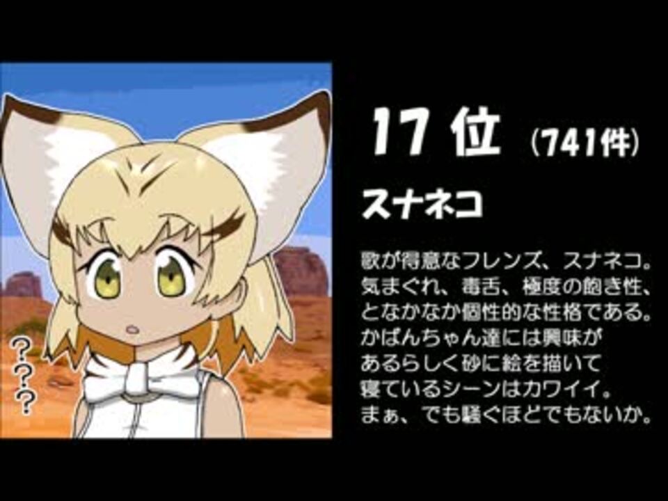 イラスト投稿サイトpixivにて<br />けものフレンズキャラの<br />作品タグ数を調査しました。(2017/8/1付)<br /><br />今回は20位から11位までランキングで発表します!<br />この場合、描き手による人気度ですが、<br />作品タグ数 = 見る側の需要数 をある程度反映してると<br />思いますのでこの方式にしました。<br />イラストは全て自作です。サンドスターが尽きそうなのです(;´・ω・)<br />それではランキングをお楽しみください!<br /><br /><br />また順位が僅差のキャラは、<br />日が経てば逆転することもあると思います。<br />その点はご留意ください。<br />あくまで大体の人気と順位を知るための調査です。<br />10位~1位→<a href="https://www.nicovideo.jp/watch/sm31670328" class="watch">sm31670328</a><br />youtube→ <a href="https://www.youtube.com/watch?v=mO9TA9SA1ZM&lc=z220z5yppozmf5yzq04t1aokgq3nz2ymt4s1ktqg1pnvbk0h00410.1501863819396241" target="_blank" rel="noopener nofollow">https://www.youtube.com/watch?v=mO9TA9SA1ZM&lc=z220z5yppozmf5yzq04t1aokgq3nz2ymt4s1ktqg1pnvbk0h00410.1501863819396241</a><br /><br />Twitter→<a href="https://twitter.com/Shin_Nosukeeee" target="_blank" rel="noopener nofollow">https://twitter.com/Shin_Nosukeeee</a> <br />
