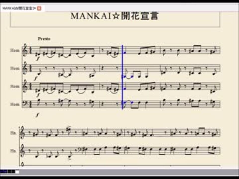 以前【けものフレンズ】ようこそジャパリパークへ【ホルン四重奏】(<a href="https://www.nicovideo.jp/watch/sm30747869" class="watch">sm30747869</a>)を投稿させていただいた者です。<br />前作はコメントやマイリスありがとうございます。<br />けものフレンズで大石昌良さんの楽曲に触れてから、ファンになりました。<br />そのまま「A3!っていうゲームの主題歌もやってるのか~ちょっと見てみよう!」という軽い気持ちで始めたのがきっかけでした。<br />A3!は沼でした。ちなみに皆木綴推しです。<br />MANKAI☆開花宣言もすごくいい曲で、ずっと聞いてます。ホルンカルテットなんてほんとに需要ないと思いますが、私の完全な自己満足で作りました。<br /><br /><br />新作できました。<br />【アイナナ/MEZZO"】miss you…【ホルン四重奏】→<a href="https://www.nicovideo.jp/watch/sm32107072" class="watch">sm32107072</a>