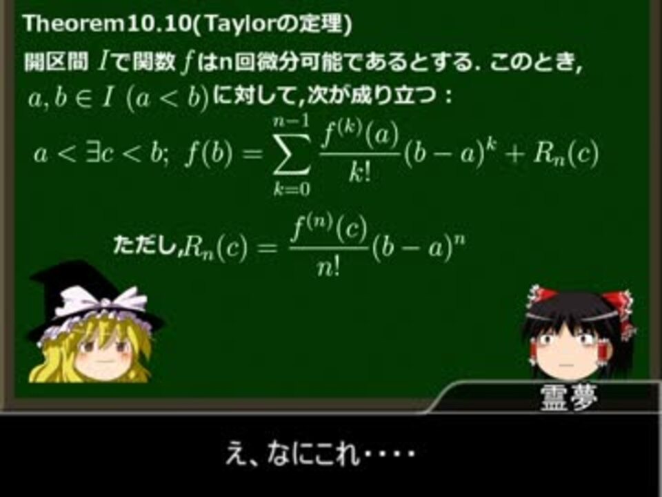 今回はTaylorの定理についてがメインです.非常に微分積分らしい定理なので味わい深いです.<br />動画のPDFファイルまとめ→<a href="https://ch.nicovideo.jp/article/ar1109609" target="_blank" rel="noopener">ar1109609</a><br />今まで作った動画→<a href="https://www.nicovideo.jp/mylist/55508572" target="_blank" rel="noopener">mylist/55508572</a><br />part1→<a href="https://www.nicovideo.jp/watch/sm29631942" class="watch">sm29631942</a><br /><br /><a href="https://www.nicovideo.jp/watch/sm31584730" class="watch">sm31584730</a>←前 次→<a href="https://www.nicovideo.jp/watch/sm32170571" class="watch">sm32170571</a><br />付録→<a href="https://www.nicovideo.jp/mylist/58747355" target="_blank" rel="noopener">mylist/58747355</a> (付録はブロマガです.本編で扱った内容+αという感じです.)<br /><br />※親作品はその1にまとめさせていただいております。なにか問題があればご連絡ください。<br /><br />てつ さん asdfasdf さん広告ありがとうございます.