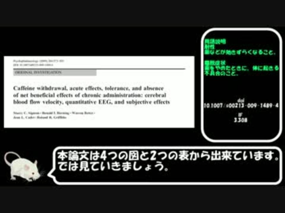 コーヒーをやめて頭痛がしたあなた、アウトですよ<br />広告誠にアリシャス!<br />2017年8/13,14,15,16,17,18,19,22,23,27,9/4<br /><br />Part3→<a href="https://www.nicovideo.jp/watch/sm31663243" class="watch">sm31663243</a><br />Part5→<a href="https://www.nicovideo.jp/watch/sm31952723" class="watch">sm31952723</a><br /><br />これまで作ったもの<br /><a href="https://www.nicovideo.jp/mylist/55689059" target="_blank" rel="noopener">mylist/55689059</a><br />カフェインシリーズマイリスト<br /><a href="https://www.nicovideo.jp/mylist/59434345" target="_blank" rel="noopener">mylist/59434345</a><br /><br />ご意見、ご感想、ご要望などはこちらへ<br /><a href="https://twitter.com/lifesch_doc_P" target="_blank" rel="noopener nofollow">https://twitter.com/lifesch_doc_P</a><br /><br />お借りしたイラスト<br />© 2016 DBCLS 統合TV, licensed under Creative Commons Attribution 4.0 International license (CC-BY-4.0)<br /><a href="http://www.ac-illust.com/" target="_blank" rel="noopener nofollow">http://www.ac-illust.com/</a><br />お借りしたBGM<br /><a href="https://dova-s.jp/bgm/play4484.html" target="_blank" rel="noopener nofollow">https://dova-s.jp/bgm/play4484.html</a><br />引用文献doi:10.1007/s00213-009-1489-4