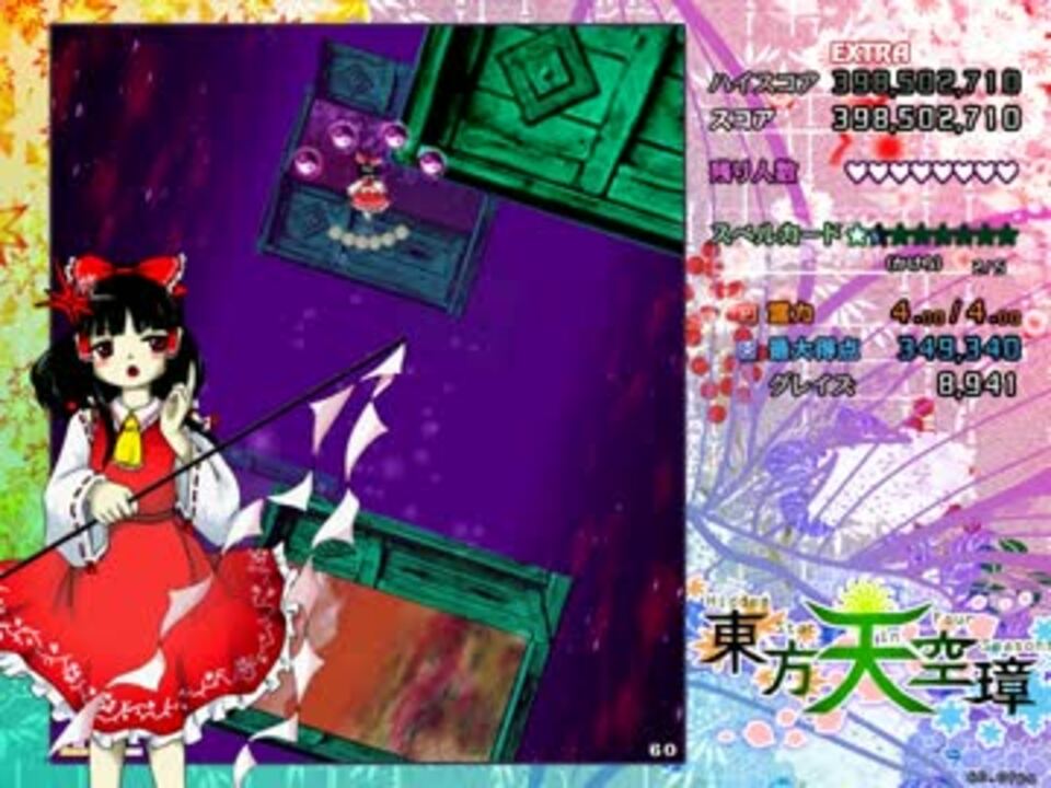 フレーム数:22168F(Extra開始から最終入力まで)<br>使用ツール:hourglass<br>追記回数:8607回<br><br><font color="red">本走→完成(<a href="https://www.nicovideo.jp/watch/sm32024241" class="watch">sm32024241</a>)</font><br><br>※自機は霊夢1択(本走にて解説)。<br> メイン:威力14×2way 発生3F毎(土用と被りほぼ無価値)<br> 霊夢サブ:威力9×P数way 発生5F毎<br> 土用サブ:威力13×レベル数way 発生3F毎<br> 移動と低速を組み合わせてオプション配置を微調整、常時キャップ回避<br><br><a href="https://www.nicovideo.jp/mylist/37217032" target="_blank" rel="noopener">mylist/37217032</a><br /><br><br>~~~動画共通説明文~~~<br>pixiv fanboxを設立しました。<br>支援していただけるとモチベの向上に繋がります。<br><a href="https://www.pixiv.net/fanbox/creator/52532041" target="_blank" rel="noopener nofollow">https://www.pixiv.net/fanbox/creator/52532041</a>