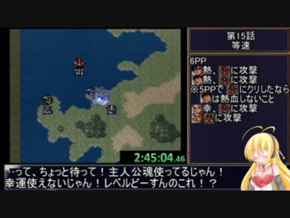 第4次スパロボRTA第15話『ミーアの決意』です。<br />致命的なガバプレイ炸裂回。<br /><br />※録画失敗のため、タイマーは別撮りです。<br />※特に禁止のバグは設定していませんが、もしED呼び出しやマップ飛ばしのようなバグがあればそれらは禁止とします。<br /><br />立ち絵元:かにぢる氏(Twitter:@kanidiru)<br />頂いた支援絵:<a href="https://seiga.nicovideo.jp/seiga/im6993446" target="_blank" rel="noopener">im6993446</a> ←我が動画のアイドルコンビ(?)の可愛くて勇ましい絵<br /><br />Part14→<a href="https://www.nicovideo.jp/watch/sm31809736" class="watch">sm31809736</a> Part16→<a href="https://www.nicovideo.jp/watch/sm31900540" class="watch">sm31900540</a><br />マイリス:<a href="https://www.nicovideo.jp/mylist/30963290" target="_blank" rel="noopener">mylist/30963290</a> ←モンスターファーム2RTAなど<br /> <a href="https://www.nicovideo.jp/mylist/58988950" target="_blank" rel="noopener">mylist/58988950</a> ←ACNB対戦動画<br />コミュ :co1258042<br />Twitter :@OG_25nama<br />