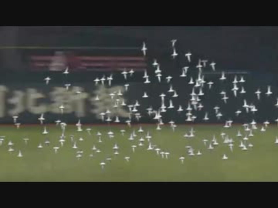 雨がやんだと思えば鳥の集団が…<br />笛を鳴らす→花火を打ち上げる→球場の照明を消す→鳥がいなくなる→なぜかドローンがとぶ<br />追記:鳥対策として爆音装置を設置したようです