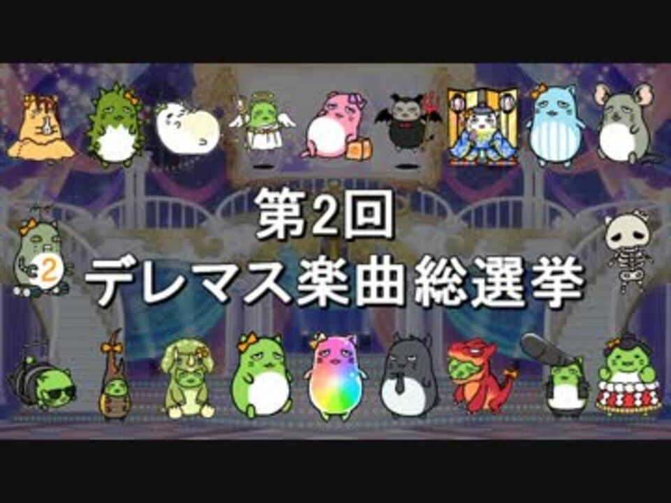 <font color="red"><font size="7">祝! デレステ2周年!!!</font></font><br /><br />2017/9/3までに音源の存在するデレマス楽曲<font color="blue">219曲</font>に対する人気投票企画です。<br />投票対象から<font color="green">最大12曲</font>(<font color="pink">3P:1曲</font>/<font color="sky_blue">2P:1~3曲</font>/<font color="orange">1P:1~8曲</font>)を選択。<br />※投票回数は1ユーザーにつき1回のみとします(重複回答者の2回目以降の回答は無効)。<br /><br />★総合結果 BEST100:<a href="https://www.nicovideo.jp/watch/sm32337308" class="watch">sm32337308</a>/P属性別 BEST70:<a href="https://www.nicovideo.jp/watch/sm32337347" class="watch">sm32337347</a><br /><br />○投票対象一覧:<a href="https://ch.nicovideo.jp/article/ar1266605" target="_blank" rel="noopener">ar1266605</a><br />○中間1回目:<a href="https://www.nicovideo.jp/watch/sm31895757" class="watch">sm31895757</a><br /><br />●第1回最終結果:<a href="https://www.nicovideo.jp/watch/sm30136436" class="watch">sm30136436</a><br />●デレマス 楽曲総選挙:<a href="https://www.nicovideo.jp/mylist/56869647" target="_blank" rel="noopener">mylist/56869647</a><br />●アイマス関連のランキング動画:<a href="https://www.nicovideo.jp/mylist/57911966" target="_blank" rel="noopener">mylist/57911966</a><br />
