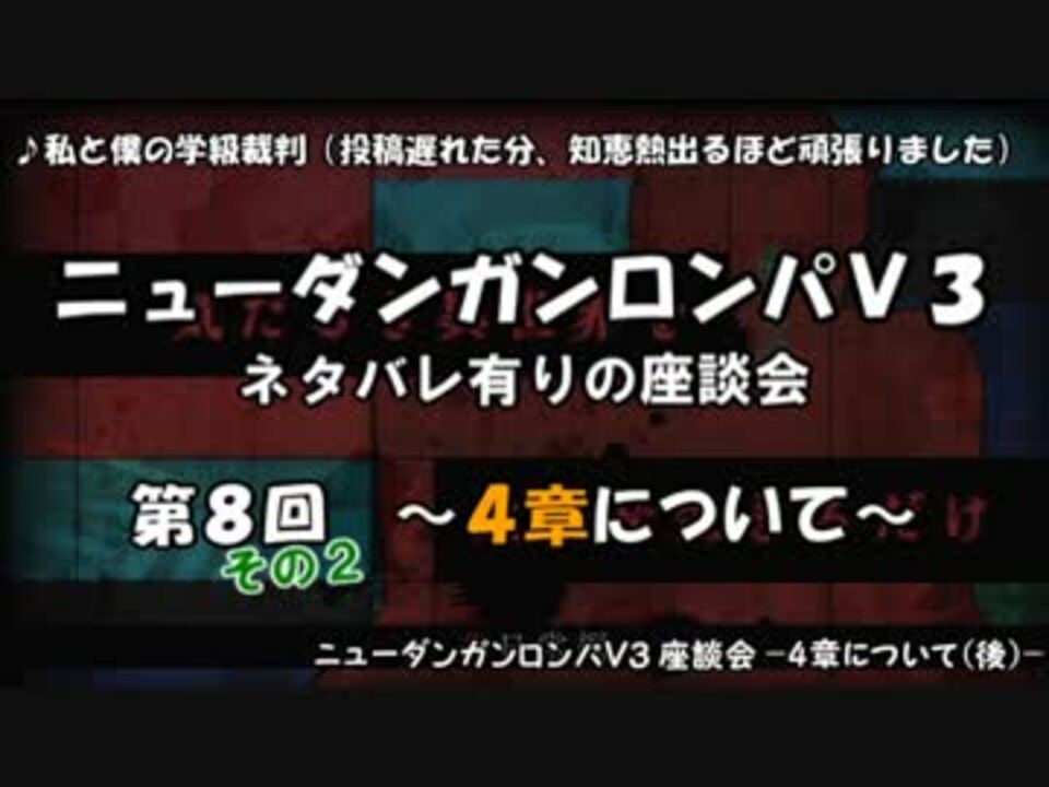 <font size=4><b>まさかの朝投稿</b></font><br /><br />毎度のごとき遅れっぷり。代わりに十分すぎるほど考察を練ってきました。よろしくお願い致します。<br /><b>声ちょっと小さいかもだからイヤホン推奨</b><br /><br /><font color="red"><b>前回の座談会 <a href="https://www.nicovideo.jp/watch/sm31777966" class="watch">sm31777966</a><br />座談会マイリス <a href="https://www.nicovideo.jp/mylist/60206851" target="_blank" rel="noopener">mylist/60206851</a></b></font><br /><br /><b>経過報告 <a href="https://www.nicovideo.jp/watch/sm32097502" class="watch">sm32097502</a><br /><br /><font size=5>座談会 part9 <a href="https://www.nicovideo.jp/watch/sm32136141" class="watch">sm32136141</a></b></font><br /><br />ダンロンV3お勧め動画まとめ <a href="https://www.nicovideo.jp/mylist/58382595" target="_blank" rel="noopener">mylist/58382595</a><br /><br /><a href="#" class="seekTime" data-seekTime="3:05" onclick="seekNicoPlayer('#3:05'); return false;">#3:05</a> 4章非日常編 初見時の感想<br /><a href="#" class="seekTime" data-seekTime="10:40" onclick="seekNicoPlayer('#10:40'); return false;">#10:40</a> 1:カードキーについて<br /><a href="#" class="seekTime" data-seekTime="14:28" onclick="seekNicoPlayer('#14:28'); return false;">#14:28</a> 2:百田が王馬を殴るシーンについて<br /><a href="#" class="seekTime" data-seekTime="17:50" onclick="seekNicoPlayer('#17:50'); return false;">#17:50</a> 3:[友達になろう]発言の意図<br /><a href="#" class="seekTime" data-seekTime="26:30" onclick="seekNicoPlayer('#26:30'); return false;">#26:30</a> 4:王馬の目的は?<br /><a href="#" class="seekTime" data-seekTime="40:08" onclick="seekNicoPlayer('#40:08'); return false;">#40:08</a> 5:王馬に1票投じたのは誰?<br /><a href="#" class="seekTime" data-seekTime="44:30" onclick="seekNicoPlayer('#44:30'); return false;">#44:30</a> 6:クロの心情考察<br /><a href="#" class="seekTime" data-seekTime="55:15" onclick="seekNicoPlayer('#55:15'); return false;">#55:15</a> 7:被害者の心情考察<br /><a href="#" class="seekTime" data-seekTime="62:20" onclick="seekNicoPlayer('#62:20'); return false;">#62:20</a> 8:オシオキ考察<br /><br /><b>Twitter → @HiT0318</b>