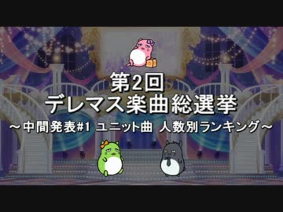 <font size="5">ついに来たか「こいかぜ」・・・</font><br /><br />2017/9/3までに音源の存在するデレマス楽曲<font color="blue">219曲</font>に対する人気投票企画の<br />中間発表1回目です。<br />参加者500名の結果をもとに<font color="red">「ユニット曲」</font>を<font color="green">人数別に分類</font>し、それぞれの<br />TOP5(<font color="orange">5人曲</font>のみTOP10)をご紹介します。<br /><br />★総合結果 BEST100:<a href="https://www.nicovideo.jp/watch/sm32337308" class="watch">sm32337308</a>/P属性別 BEST70:<a href="https://www.nicovideo.jp/watch/sm32337347" class="watch">sm32337347</a><br /><br />○告知動画:<a href="https://www.nicovideo.jp/watch/sm31853423" class="watch">sm31853423</a><br />○投票対象一覧:<a href="https://ch.nicovideo.jp/article/ar1266605" target="_blank" rel="noopener">ar1266605</a><br />○中間2回目:<a href="https://www.nicovideo.jp/watch/sm31926535" class="watch">sm31926535</a><br /><br />●第1回最終結果:<a href="https://www.nicovideo.jp/watch/sm30136436" class="watch">sm30136436</a><br />●アイマス関連のランキング動画:<a href="https://www.nicovideo.jp/mylist/57911966" target="_blank" rel="noopener">mylist/57911966</a><br />●デレマス 楽曲総選挙:<a href="https://www.nicovideo.jp/mylist/56869647" target="_blank" rel="noopener">mylist/56869647</a><br /><br /><b>※順位バレ防ぐためにリスト順で表示しています。ご視聴の際はご注意ください。</b>