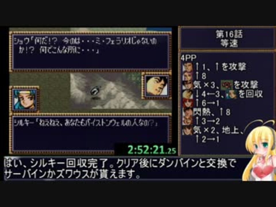 第4次スパロボRTA第16話『大将軍ガルーダの悲劇』です。<br />DQRTAやってたり、残業だったり、睡眠不足だったり、休日出勤だったりで遅くなってすみません。<br /><br />※録画失敗のため、タイマーは別撮りです。<br />※特に禁止のバグは設定していませんが、もしED呼び出しやマップ飛ばしのようなバグがあればそれらは禁止とします。<br /><br />立ち絵元:かにぢる氏(Twitter:@kanidiru)<br />頂いた支援絵:<a href="https://seiga.nicovideo.jp/seiga/im6993446" target="_blank" rel="noopener">im6993446</a> ←我が動画のアイドルコンビ(?)の可愛くて勇ましい絵<br /><br />Part15→<a href="https://www.nicovideo.jp/watch/sm31839028" class="watch">sm31839028</a> Part17→<a href="https://www.nicovideo.jp/watch/sm31908654" class="watch">sm31908654</a><br />マイリス:<a href="https://www.nicovideo.jp/mylist/30963290" target="_blank" rel="noopener">mylist/30963290</a> ←モンスターファーム2RTAなど<br /> <a href="https://www.nicovideo.jp/mylist/58988950" target="_blank" rel="noopener">mylist/58988950</a> ←ACNB対戦動画<br />コミュ :co1258042<br />Twitter :@OG_25nama<br />