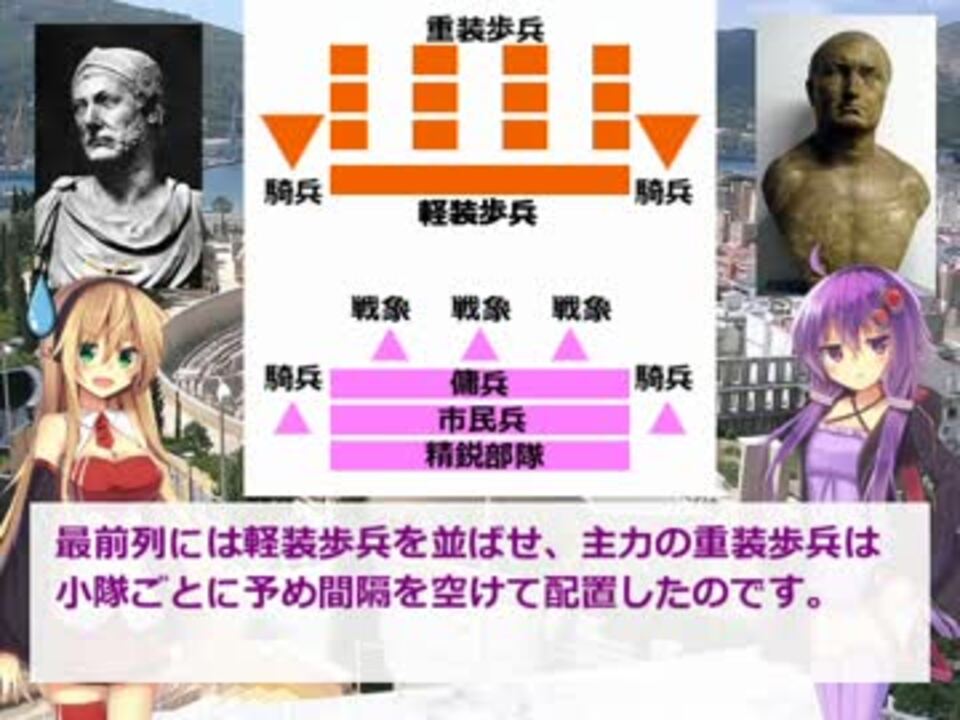 第二次ポエニ(ハンニバル)戦争、ついに決着! 動画時間はすまんかった...<br />(一部音声や会話文に乱れがあるみたいです。ご容赦ください。)<br /><br /><a href="#" class="seekTime" data-seekTime="0:00" onclick="seekNicoPlayer('#0:00'); return false;">#0:00</a> プロローグ・導入 <a href="#" class="seekTime" data-seekTime="1:22" onclick="seekNicoPlayer('#1:22'); return false;">#1:22</a> 第一章 ハンニバルの誤算 <a href="#" class="seekTime" data-seekTime="4:34" onclick="seekNicoPlayer('#4:34'); return false;">#4:34</a> 第二章 もう一人の「天敵」<br /><a href="#" class="seekTime" data-seekTime="7:59" onclick="seekNicoPlayer('#7:59'); return false;">#7:59</a> 第三章 スキピオ登場 <a href="#" class="seekTime" data-seekTime="15:45" onclick="seekNicoPlayer('#15:45'); return false;">#15:45</a> 第四章 アフリカ上陸<br /><a href="#" class="seekTime" data-seekTime="23:03" onclick="seekNicoPlayer('#23:03'); return false;">#23:03</a> 第五章 ザマの戦い <a href="#" class="seekTime" data-seekTime="29:57" onclick="seekNicoPlayer('#29:57'); return false;">#29:57</a> エピローグ・素材紹介<br /><br />●part1(ローマ建国) → <a href="https://www.nicovideo.jp/watch/sm31041225" class="watch">sm31041225</a> part4(ポエニ戦争前編) → <a href="https://www.nicovideo.jp/watch/sm31670338" class="watch">sm31670338</a><br /> part6 (ポエニ戦争後編)→ <a href="https://www.nicovideo.jp/watch/sm32166923" class="watch">sm32166923</a> ローマ帝国解説リスト → <a href="https://www.nicovideo.jp/mylist/59073700" target="_blank" rel="noopener">mylist/59073700</a><br /><br />●いのっちコミュニティ → co3096574 ついったー @inocchi_0515<br />