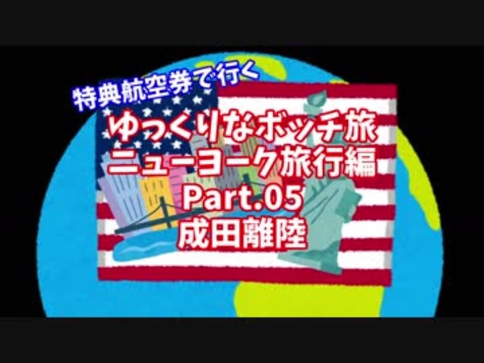 【ゆっくり】ゆっくりなボッチ旅 ニューヨーク旅行編 Part.05【ボッチ】<br />1日目<br />成田離陸<br /><br />2017年八月に米国はニューヨークに行ってきました。<br />ついにNY往きの飛行機に搭乗しました。<br />そして、うぷ主の乗った飛行機は成田を離陸します。<br />Twitter: @elmarit44<br /><br />次:<a href="https://www.nicovideo.jp/watch/sm32054904" class="watch">sm32054904</a><br />前:<a href="https://www.nicovideo.jp/watch/sm31981489" class="watch">sm31981489</a><br />Part.01はこちら:<a href="https://www.nicovideo.jp/watch/sm31853566" class="watch">sm31853566</a><br />2017年ニューヨーク旅行:<a href="https://www.nicovideo.jp/mylist/59688559" target="_blank" rel="noopener">mylist/59688559</a><br /><br />□過去のシリーズ<br />2017年台北旅行:<a href="https://www.nicovideo.jp/mylist/58686511" target="_blank" rel="noopener">mylist/58686511</a><br /><br />□撮影機材<br />SONY HDR-AS300<br />Panasonic LUMIX DMC-GX7MK2<br /><br />□動画作成<br />・ゆっくりMovie Maker3<br />・AviUtl<br />・x264guiEx<br />・けいふぉんと<br />・いらすとや<br />・無料効果音で遊ぼう!<br />・音楽研究所<br />