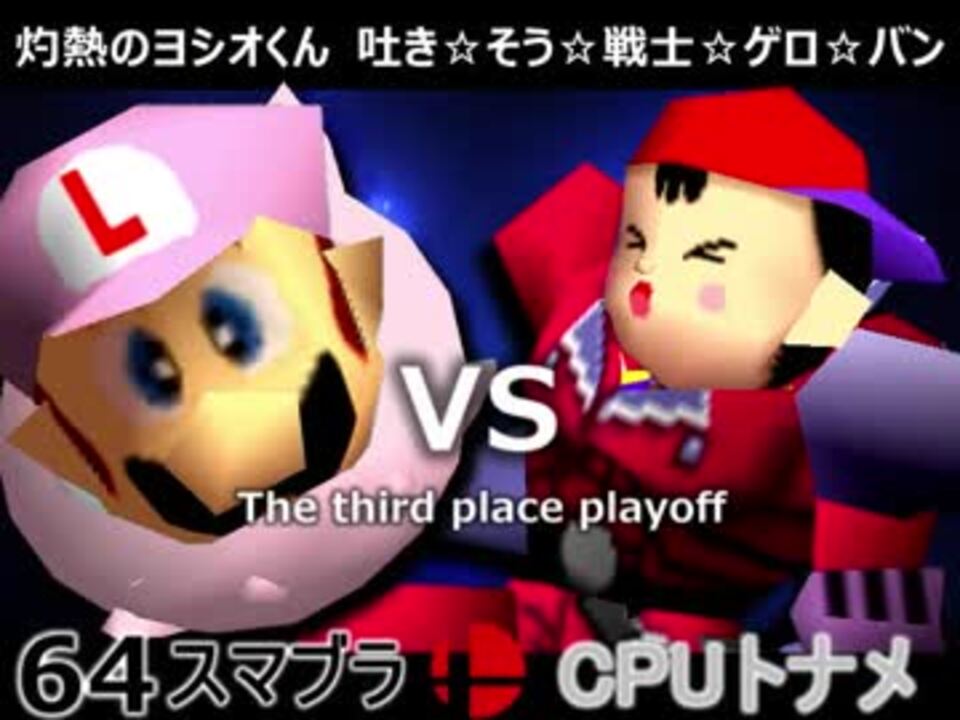仲悪すぎる<br /><u>※どちらが勝つかアンケ結果(Twitter調べ)</u><br />灼熱のヨシオくん 60% VS 吐き☆そう☆戦士☆ゲロ☆バン 40%<br /><br /><font color="#0000ff"><u>※64スマブラCPUトナメ実況のwikiができた模様</u>→</font> <a href="https://wiki3.jp/cpu_64" target="_blank" rel="noopener nofollow">https://wiki3.jp/cpu_64</a><br /><br /><b><font size="5"><font color="#ff0000">次→</font></font></b>【<a href="https://www.nicovideo.jp/watch/sm32086899" class="watch">sm32086899</a>】<br /><br /><b><font size="3"><font color="#0000ff">【第五回】をどうするか放送→</font></font></b>【<a href="https://live.nicovideo.jp/watch/lv307374314" target="_blank" rel="noopener">lv307374314</a>】<br /><br />前【<a href="https://www.nicovideo.jp/watch/sm32037596" class="watch">sm32037596</a>】 第一試合【<a href="https://www.nicovideo.jp/watch/sm31974819" class="watch">sm31974819</a>】<br /><br />第三回大会【<a href="https://www.nicovideo.jp/watch/sm31228643" class="watch">sm31228643</a>】<br />第二回大会【<a href="https://www.nicovideo.jp/watch/sm31072246" class="watch">sm31072246</a>】<br />第一回大会【<a href="https://www.nicovideo.jp/watch/sm23906204" class="watch">sm23906204</a>】<br />64スマブラリスト【<a href="https://www.nicovideo.jp/mylist/27365529" target="_blank" rel="noopener">mylist/27365529</a>】<br />その他シリーズ【<a href="https://www.nicovideo.jp/mylist/12965027" target="_blank" rel="noopener">mylist/12965027</a>】<br /><br /><b><font color="#00bfff">Twitter</font></b>【@niconicopppppp】<br /><b><font color="#ff4500">チャンネル</font></b>【<a href="https://ch.nicovideo.jp/p-desu" target="_blank" rel="noopener">ch.nicovideo.jp/p-desu</a>】