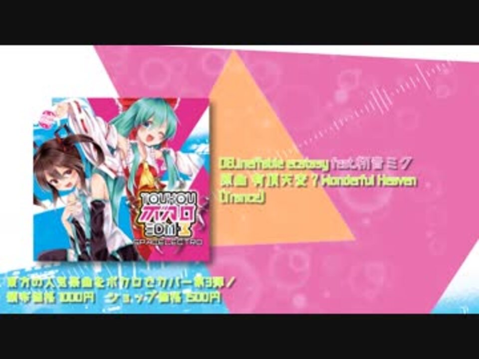東方の人気楽曲をボカロでカバー第3弾!<br />イラスト ちくわさび<br />デザイン 三毛や巣穴<br />動画 いくせん <a href="https://www.nicovideo.jp/mylist/39263448" target="_blank" rel="noopener">mylist/39263448</a><br />曲 Spacelectro<br />頒布価格 1000円 ショップ価格 1500円<br /><br />■博麗神社秋季例大祭<br />日時 2017年10月15日(日)<br />会場 東京ビッグサイト 東ホール<br />配置 う41b<br /><br />■東方紅楼夢<br />日時 2017/10/22(日)<br />会場 大阪・インテックス大阪<br />配置 J-04a<br /><br />■M3-2017秋<br />開催日時 2017年10月29日(日)<br />会場 東京流通センター(TRC) 第一・第二展示場<br />配置 か-19a<br /><br />■大⑨州東方祭27<br />開催日 2017年11月5日(日)<br />開催場所 北九州市・西日本総合展示場<br />配置 K-10<br /><br />■THE VOC@LOiD M@STER38<br />日時 2017年11月12日(日)<br />会場:池袋:サンシャインシティ<br />ワールドインポートマート4階展示ホールA1<br />配置 B13