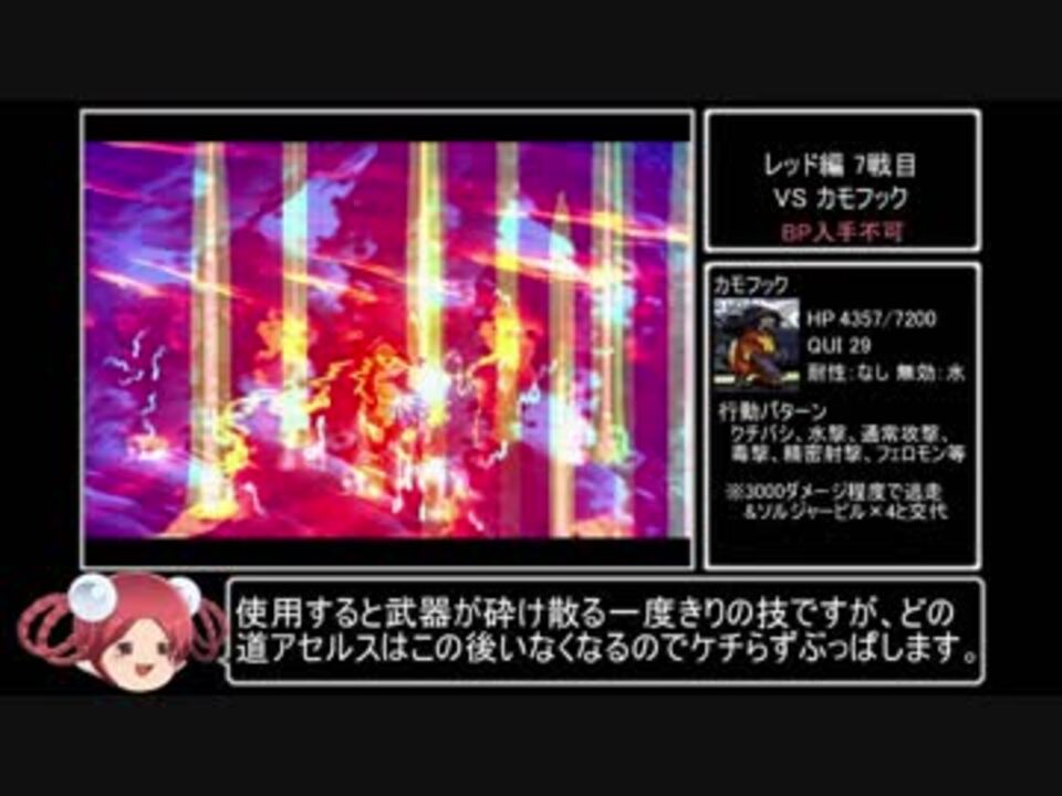 5~7戦目。レッド編は全32戦です。<br><br>縛り内容<br>1.最少戦闘回数クリア(7人クリアで開発2部)<br>2.技術習得禁止(武器防具の固有技術・アイテムの使用はOK)<br>3.ジャンク漁り禁止<br>4.イカサマ資金稼ぎ禁止(通常の金取引はOK)<br>5.オーヴァドライブ中の万能油or停滞のルーン禁止<br>6.オープントレイやメモリ破壊による戦闘回数削減禁止<br><br><a href="https://www.nicovideo.jp/watch/sm32049228" class="watch">sm32049228</a>←part27|part29→<a href="https://www.nicovideo.jp/watch/sm32123548" class="watch">sm32123548</a><br>レッド編①(part26)→<a href="https://www.nicovideo.jp/watch/sm32008468" class="watch">sm32008468</a><br><a href="https://www.nicovideo.jp/mylist/59171218" target="_blank" rel="noopener">mylist/59171218</a><br><br>YouTube版→<a href="https://goo.gl/oey5Y7" target="_blank" rel="noopener nofollow">https://goo.gl/oey5Y7</a><br>他の挑戦シリーズとか→<a href="https://www.nicovideo.jp/mylist/3220744" target="_blank" rel="noopener">mylist/3220744</a><br><br>© 1997, 2021 SQUARE ENIX CO., LTD. All Rights Reserved. ILLUSTRATION: TOMOMI KOBAYASHI当該作品の転載・配布は禁止いたします。