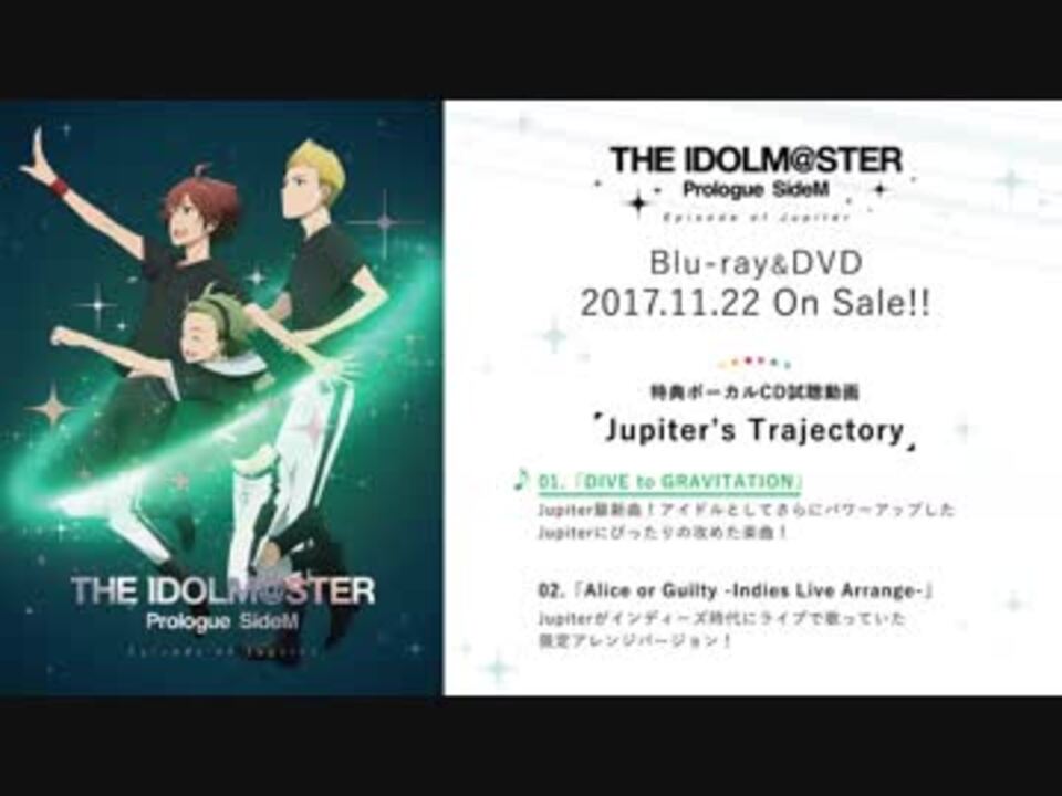 <a href="http://imas-sidem.com/" target="_blank" rel="noopener nofollow">http://imas-sidem.com/</a> より<br />11月22日(水)発売『THE IDOLM@STER Prologue SideM -Episode of Jupiter-』完全生産限定版特典ディスク「Jupiter's Trajectory」収録楽曲公開!先行試聴実施中!<br /> <br />■ボーカルCD「Jupiter's Trajectory」<br /><br />01.「DIVE to GRAVITATION」<br />Jupiter最新曲!アイドルとしてさらにパワーアップしたJupiterにぴったりの攻めた楽曲!<br />02.「Alice or Guilty ?Indies Live Arrange-」<br />Jupiterがインディーズ時代にライブで歌っていた限定アレンジバージョン!<br />03.「DIVE to GRAVITATION -Instrumental- 」 <br />