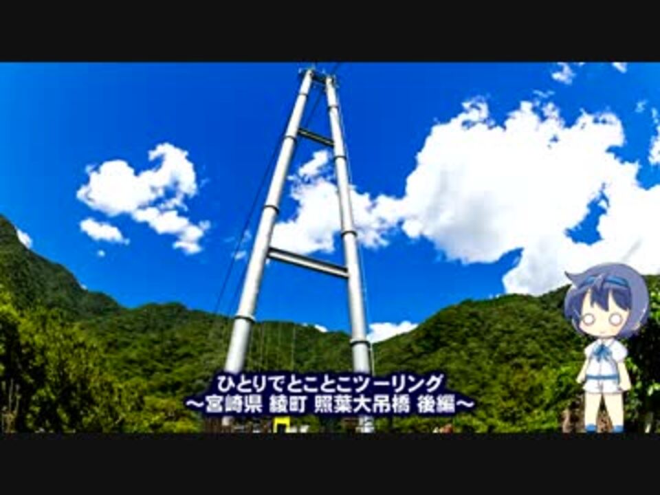 吊り橋リベンジマッチ回。<br />風も収まって、人が少なかったので帰りは撮影ができました。がんばりました。褒めて!<br />ほぼノーカットです。雰囲気が少しでも伝わると良いのですが。<br />あと酒泉の杜にも寄ってきました。バイクで行ったので試飲ができませんでしたが、お酒好きにはたまらない場所だと思います。宿泊施設もあるので、泊まりがけで楽しめますよ。<br />■ブロマガ <a href="https://ch.nicovideo.jp/article/ar1353093" target="_blank" rel="noopener">ar1353093</a><br />■前回 宮崎02 <a href="https://www.nicovideo.jp/watch/sm32134168" class="watch">sm32134168</a> ■次回 未定<br />■BGM 森の踊り <a href="https://commons.nicovideo.jp/works/nc148115" target="_blank" rel="noopener">nc148115</a><br />■鹿児島関係の動画 <a href="https://www.nicovideo.jp/mylist/8893723" target="_blank" rel="noopener">mylist/8893723</a><br />■ユーザページ <a href="https://www.nicovideo.jp/user/347413" target="_blank" rel="noopener">user/347413</a>