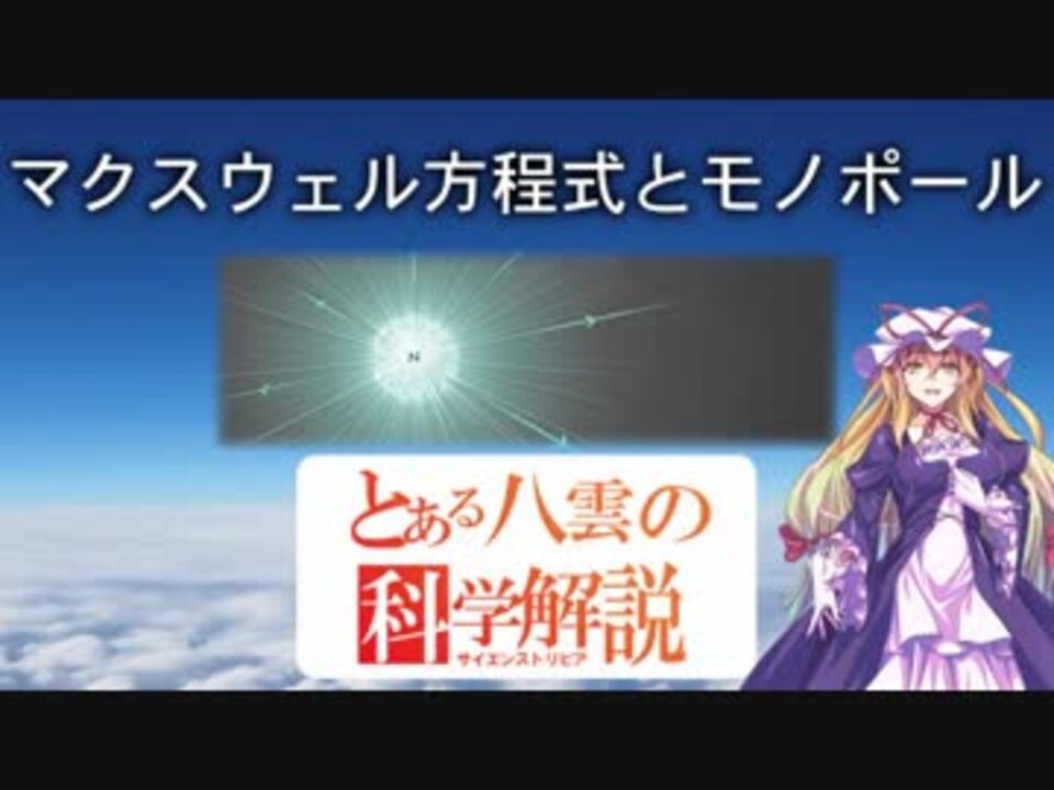 モノポールがもしあった時の、マクスウェル方程式についてです。<br><br>ffo-on様 Åkira@砂袋様 うさみみれんこん様 asdfasdf様 白庭様 よっち様 ゆきみどり様 ilim様 drkphilia様 Troy様 えりっき様 sin-taku55様 SUZAN様 UCCYAN様 だらー様 くらふと様 nic様 Emmett L Brown様 だいこん様 nak様 でくぽん先生様 kei1106様 ki様 広告ありがとうございます。<br><br>とある八雲の科学解説シリーズ <a href="https://www.nicovideo.jp/mylist/58019196" target="_blank" rel="noopener">mylist/58019196</a><br>前回 『空はなぜ青いの?への答え方』 <a href="https://www.nicovideo.jp/watch/sm31877883" class="watch">sm31877883</a><br>次回 『D-Wave社の量子コンピュータ』 <a href="https://www.nicovideo.jp/watch/sm32446439" class="watch">sm32446439</a>