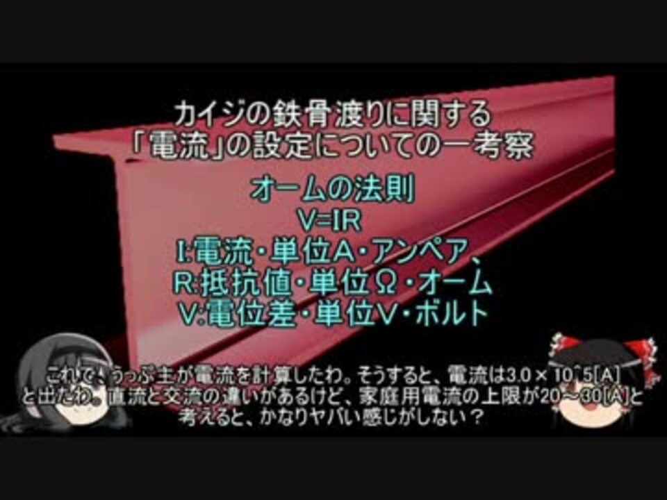 カイジの鉄骨渡りは、カイジという作品の中で有名です。<br />鉄骨渡りの第二Rでは、鉄骨の上を座って移動する事が出来無い様に、<br />電流が流されることになっていた。<br />しかし、その電流の設定に重大な問題が…<br />電気に関する、基本的な公式「オームの法則」,「電力の公式」を、<br />交えて解説する。<br /><font color="#ff0000">追記<br />当方でカイジの鉄骨の電流の方を調べてみた所、<br />鉄骨を左右に分割して、その間に絶縁体を挟んで(鉄絶鉄の形)、<br />その左右の鉄骨の間で電位差を設けるという説が、現在最有力の様です。<br />やはり、鉄骨の両端で電位差を設けるのは、無謀と言う事です。<br />帝愛を甘く見ていた、うっぷ主は猛省中です。<br />機会があれば、最有力の説で再検証と思います。<br /></font><br />マイリスト <a href="https://www.nicovideo.jp/mylist/12818453" target="_blank" rel="noopener">mylist/12818453</a><br />