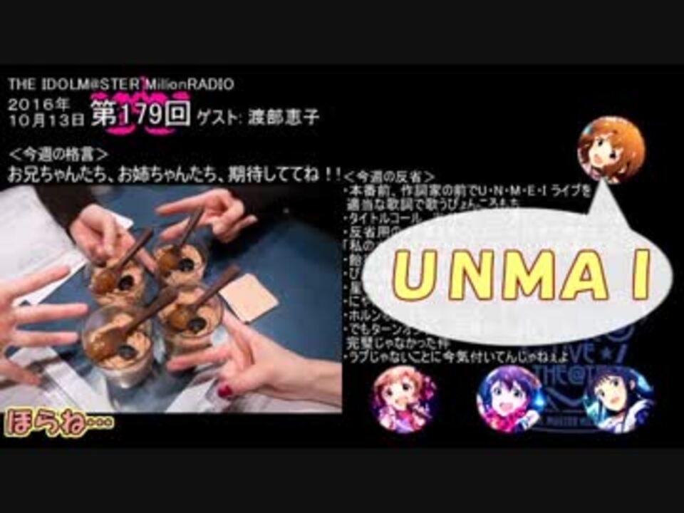 今日(11/6)が桃子パイセンの誕生日、ということで前からまとめようと思ってた恵子さんゲストのミリラジ第179回の単発まとめです。ツッコミがいると話が進みますね。<br /><br />もしよろしければこちらもどうぞ<br />【ミリラジ単発まとめ】<br />・第151回 圧の回@天&でんでん→ <a href="https://www.nicovideo.jp/watch/sm32029040" class="watch">sm32029040</a><br />・第153回 やんばい回@たかみな&あべりか→ <a href="https://www.nicovideo.jp/watch/sm31995928" class="watch">sm31995928</a><br />・第155/156回 狙われたうどんとぱぽー→ <a href="https://www.nicovideo.jp/watch/sm32532379" class="watch">sm32532379</a><br />・第157/158回 種と星→ <a href="https://www.nicovideo.jp/watch/sm32595630" class="watch">sm32595630</a><br />・第159/160/161回 ほこりとじいやとほたる→ <a href="https://www.nicovideo.jp/watch/sm32637017" class="watch">sm32637017</a><br />・第162/163/164/166回 346とお肉→ <a href="https://www.nicovideo.jp/watch/sm32697192" class="watch">sm32697192</a><br />・第167/168回 やんばい洗濯機回→ <a href="https://www.nicovideo.jp/watch/sm32424094" class="watch">sm32424094</a><br />・第170/171/172回 妄想と文房具と曲名→ <a href="https://www.nicovideo.jp/watch/sm32764026" class="watch">sm32764026</a><br />・第173/175回 無害なファンとサプライズ→ <a href="https://www.nicovideo.jp/watch/sm32456421" class="watch">sm32456421</a><br />・第176/177回 雨女とものまね→ <a href="https://www.nicovideo.jp/watch/sm32804792" class="watch">sm32804792</a><br />・第178/180回 水戸とイヤホン→ <a href="https://www.nicovideo.jp/watch/sm32846602" class="watch">sm32846602</a><br />・第182/183回 ころころとぴらみさん→ <a href="https://www.nicovideo.jp/watch/sm33292957" class="watch">sm33292957</a><br />・第184/185回 ラジオだよぉ!→ <a href="https://www.nicovideo.jp/watch/sm32942713" class="watch">sm32942713</a><br />・第188/189回 いちごとちゃんと!→ <a href="https://www.nicovideo.jp/watch/sm33115410" class="watch">sm33115410</a><br />・第165/174/186/187回 すーじーみっくあいみんぽぽちゃん→ <a href="https://www.nicovideo.jp/watch/sm32306921" class="watch">sm32306921</a><br /><br />その他ミリオン関連動画→<a href="https://www.nicovideo.jp/mylist/59676609" target="_blank" rel="noopener">mylist/59676609</a><br />