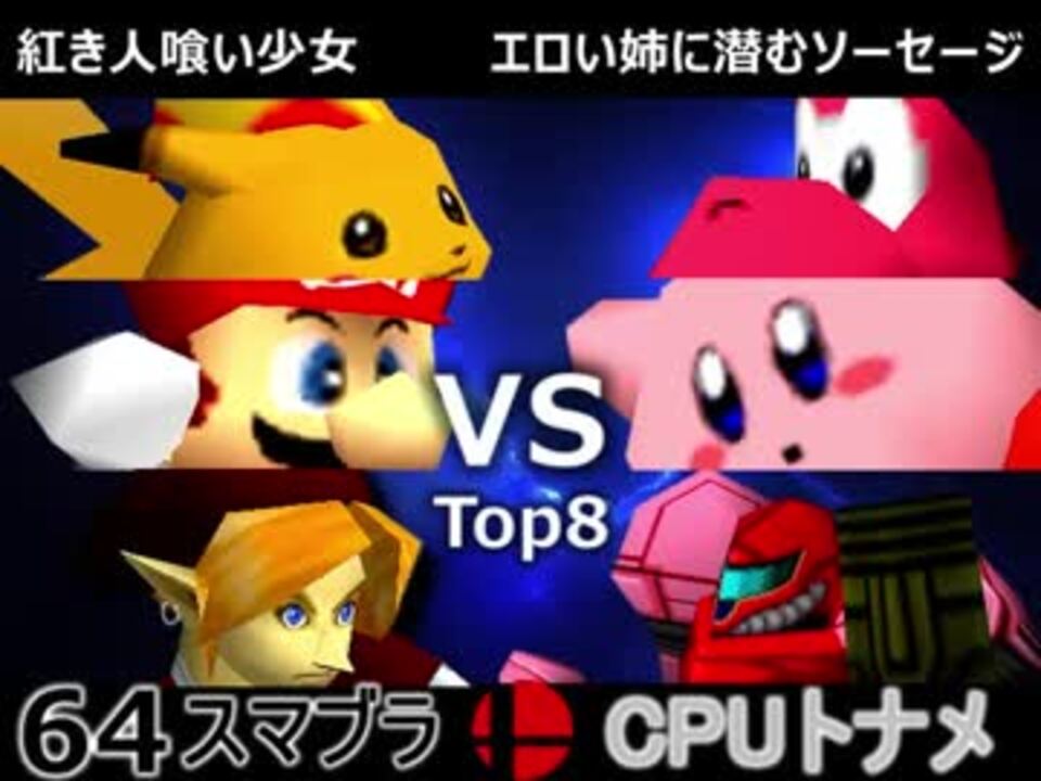 取りたい病蔓延<br /><u>※どちらが勝つかアンケ結果(Twitter調べ)</u><br />紅き人喰い少女(人喰いポイゾネチェントゥリ)39% VS エロい姉に潜むソーセージ(母姉弟)61%<br /><br /><b><font size="5"><font color="#ff0000">次→</font></font></b>【<a href="https://www.nicovideo.jp/watch/sm32317057" class="watch">sm32317057</a>】<br /><br />前【<a href="https://www.nicovideo.jp/watch/sm32297435" class="watch">sm32297435</a>】 第一試合【<a href="https://www.nicovideo.jp/watch/sm32284305" class="watch">sm32284305</a>】<br /><br />第四回大会【<a href="https://www.nicovideo.jp/watch/sm31974819" class="watch">sm31974819</a>】<br />第三回大会【<a href="https://www.nicovideo.jp/watch/sm31228643" class="watch">sm31228643</a>】<br />第二回大会【<a href="https://www.nicovideo.jp/watch/sm31072246" class="watch">sm31072246</a>】<br />第一回大会【<a href="https://www.nicovideo.jp/watch/sm23906204" class="watch">sm23906204</a>】<br />64スマブラリスト【<a href="https://www.nicovideo.jp/mylist/27365529" target="_blank" rel="noopener">mylist/27365529</a>】<br />その他シリーズ【<a href="https://www.nicovideo.jp/mylist/12965027" target="_blank" rel="noopener">mylist/12965027</a>】<br /><br /><b><font color="#00bfff">Twitter</font></b>【@niconicopppppp】<br /><b><font color="#ff4500">チャンネル</font></b>【<a href="https://ch.nicovideo.jp/p-desu" target="_blank" rel="noopener">ch.nicovideo.jp/p-desu</a>】