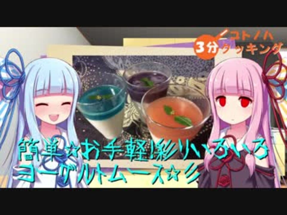 <font size="6">大変申し訳ございません!</font><br />今回、食材の一部に着色料が使用されております。オーガニックを目指しておりましたが、青い色は再現不可能だと思い、妥協させていただきました。<br />それ以外はいたって普通です。<br /><br /><br />味について↓ (色反転)<br /><font color="white">茜 → 一番おいしい。納豆の風味と酸味がマッチ?<br />葵 → 一番キツイ。アルコール入れすぎました。<br />紫 → TDN納豆。</font><br /><br />↓マイリスわけました。<br />ことのは3分クッキング創作委員会 → (<a href="https://www.nicovideo.jp/mylist/60420051" target="_blank" rel="noopener">mylist/60420051</a>)<br />実況リスト → (<a href="https://www.nicovideo.jp/mylist/59981220" target="_blank" rel="noopener">mylist/59981220</a>)