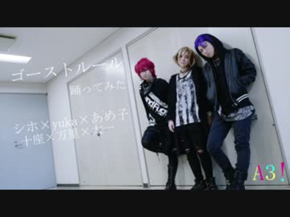 <font color=red>※コスプレをして踊っています。オリジナル衣装です。苦手な方はご注意ください。</font><br /><br />A3!の秋組高校生トリオで「ゴーストルール」を踊ってみました。<br /><br />楽曲本家様→<a href="https://www.nicovideo.jp/watch/sm27965309" class="watch">sm27965309</a><br />振付本家様→<a href="https://www.nicovideo.jp/watch/sm28892659" class="watch">sm28892659</a> :カケリネ × KO2 様<br /><br /><担当><br /><font color=#be8915>摂津 万里 <font color=purple>@</font> yuka → @shirotanbunbun【<a href="https://www.nicovideo.jp/mylist/54252027" target="_blank" rel="noopener">mylist/54252027</a>】</font><br /><font color=#797b78>兵頭 十座 <font color=purple>@</font> シホ → @shiho_startdash【<a href="https://www.nicovideo.jp/mylist/8716443" target="_blank" rel="noopener">mylist/8716443</a>】</font><br /><font color=#e95189>七尾 太一 <font color=purple>@</font> あめ子 → @candypop_ame 【<a href="https://www.nicovideo.jp/mylist/54291728" target="_blank" rel="noopener">mylist/54291728</a>】</font><br /><br />撮影・編集:シホ<br /><br /><br />▼よければこちらも!<br />同じ万里と十座が旗揚げ公演の役柄で踊っています<br /><a href="https://www.nicovideo.jp/watch/sm32016230" class="watch">sm32016230</a><br /><br />批判・誹謗中傷・辛辣なコメントはお控えください m(_ _)m<br />