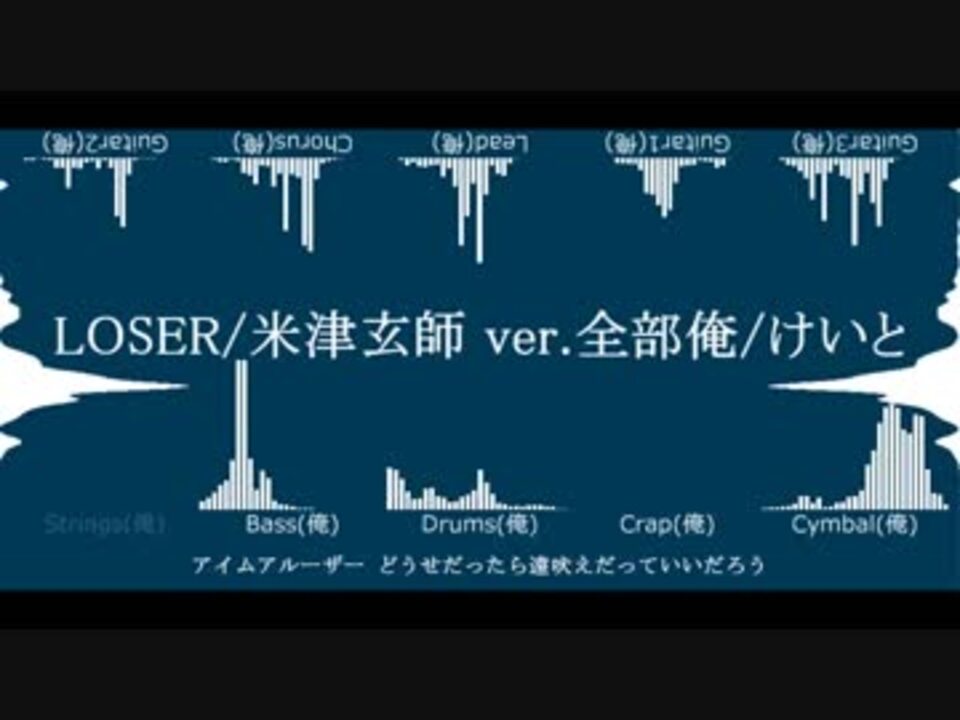 <b>※全部俺(声のみ)です。遠吠えだっていいだろう。</b> <br /><br />負け犬のけいとです。 <br />砂の惑星全部俺(<a href="https://www.nicovideo.jp/watch/sm31846893" class="watch">sm31846893</a>)に続き、今度は米津玄師さんご本人の曲にチャレンジしました。 <br /><br />声のみと書きましたが、手拍子は手です(毎度手が痛い) <br />総録音回数は451回でした。<s>ご本人に聴いてもらえたらなぁ...</s> <br /><br />最後まで聴いていただけたら嬉しいです。 <br /><br /><b>オフボーカルはこちら⇒<a href="https://www.nicovideo.jp/watch/sm32473676" class="watch">sm32473676</a></b> <br /><br />■原曲:LOSER/米津玄師 <br />■歌/動画/全部俺:けいと(<a href="https://www.nicovideo.jp/mylist/13405556" target="_blank" rel="noopener">mylist/13405556</a>) <br /> ■Twitter:<a href="https://twitter.com/A10_AtmoSphere" target="_blank" rel="noopener nofollow">https://twitter.com/A10_AtmoSphere</a> <br /><br />■ミリオン感謝:「ドーナツホール 全部俺」⇒<a href="https://www.nicovideo.jp/watch/sm22170377" class="watch">sm22170377</a> <br />■前作:「砂の惑星 全部俺」⇒<a href="https://www.nicovideo.jp/watch/sm31846893" class="watch">sm31846893</a>