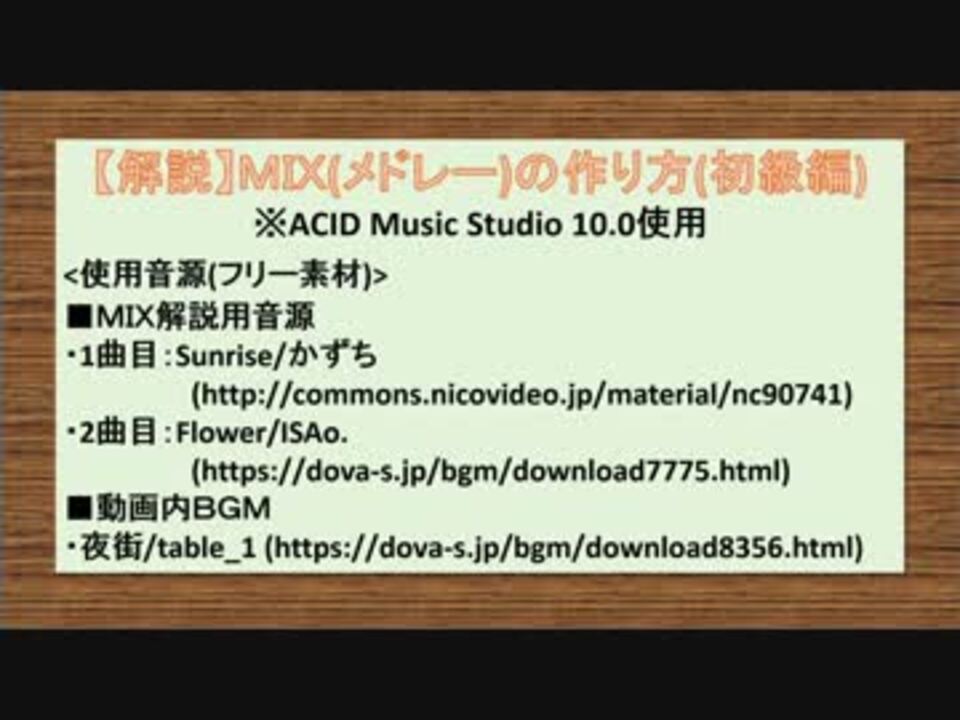 ACID Music Studio を使用してMIXを作る方法を解説した動画です。<br />主に曲の繋ぎ方を中心に、誰でもわかるよう解説しています!<br />これからDJ MIX等を作成してみたい方の参考になれば嬉しいです!<br />・音楽系マイリス:<a href="https://www.nicovideo.jp/mylist/60262351" target="_blank" rel="noopener">mylist/60262351</a><br />・作ってみた系マイリス:<a href="https://www.nicovideo.jp/mylist/60566171" target="_blank" rel="noopener">mylist/60566171</a><br />・youtube:<a href="https://youtu.be/KxRNkmtAj1Q" target="_blank" rel="noopener nofollow">https://youtu.be/KxRNkmtAj1Q</a><br />