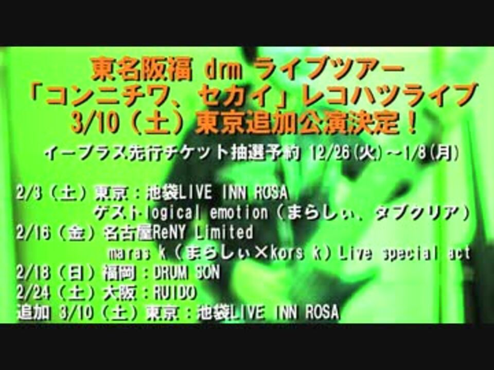 和田たけあき(くらげP)@kurage_Pさんにギターを弾いていただいた曲です!<br />さらば今年!!あけおめ!!<br />drm 1st solo album「Hello World」<br />「Hello World」特設<br /><a href="http://www.subcul-rise.jp/drm/helloworld" target="_blank" rel="noopener nofollow">http://www.subcul-rise.jp/drm/helloworld</a><br /><br />「コンニチワ、セカイ」レコハツライブ追加公演決定<br />3/10(土)東京:池袋LIVE INN ROSA<br />先行予約期間12/26(火)~1/8(月)<br /><a href="http://eplus.jp/drm" target="_blank" rel="noopener nofollow">http://eplus.jp/drm</a><br /><br />日程<br />2/3(土)東京:池袋LIVE INN ROSA ゲストlogical emotion(まらしぃ、タブクリア)<br />2/16(金)名古屋ReNY Limited maras k(marasy×kors k)Live(special act drm)<br />2/18(日)福岡:DRUM SON<br />2/24(土)大阪:RUIDO<br />追加 3/10(土)東京:池袋LIVE INN ROSA<br />