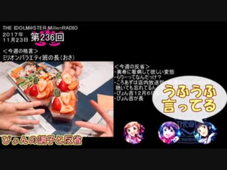 アイドルマスターミリオンライブのラジオ「ミリラジ」の11月放送の面白名場面まとめの後編です。<br />11月は動画時間が60分を超えそうだったので分割しました。<br />本作はキャラに吹き出しなんかをつけてます。また適宜、参考動画も挿入してます。<br />また、このまとめシリーズは本家に追いつかないよう1ヶ月以上経ったものを対象にしてますので時期がずれるのはご了承ください。<br /><br />【1/11追記】<br />第237回の反省にて誤植がありました。大変失礼しました。m(_ _)m<br /> 箱梨花×→星梨花○<br /><br />・ミリラジ面白名場面@17年11月_前編 → <a href="https://www.nicovideo.jp/watch/sm32555570" class="watch">sm32555570</a><br /><br />もしよろしければこちらもどうぞ<br />【次作】17年12月_前編 → <a href="https://www.nicovideo.jp/watch/sm32716836" class="watch">sm32716836</a><br />【前作】17年10月 → <a href="https://www.nicovideo.jp/watch/sm32379712" class="watch">sm32379712</a><br /><br />その他ミリオン関連動画 → <a href="https://www.nicovideo.jp/mylist/59676609" target="_blank" rel="noopener">mylist/59676609</a>