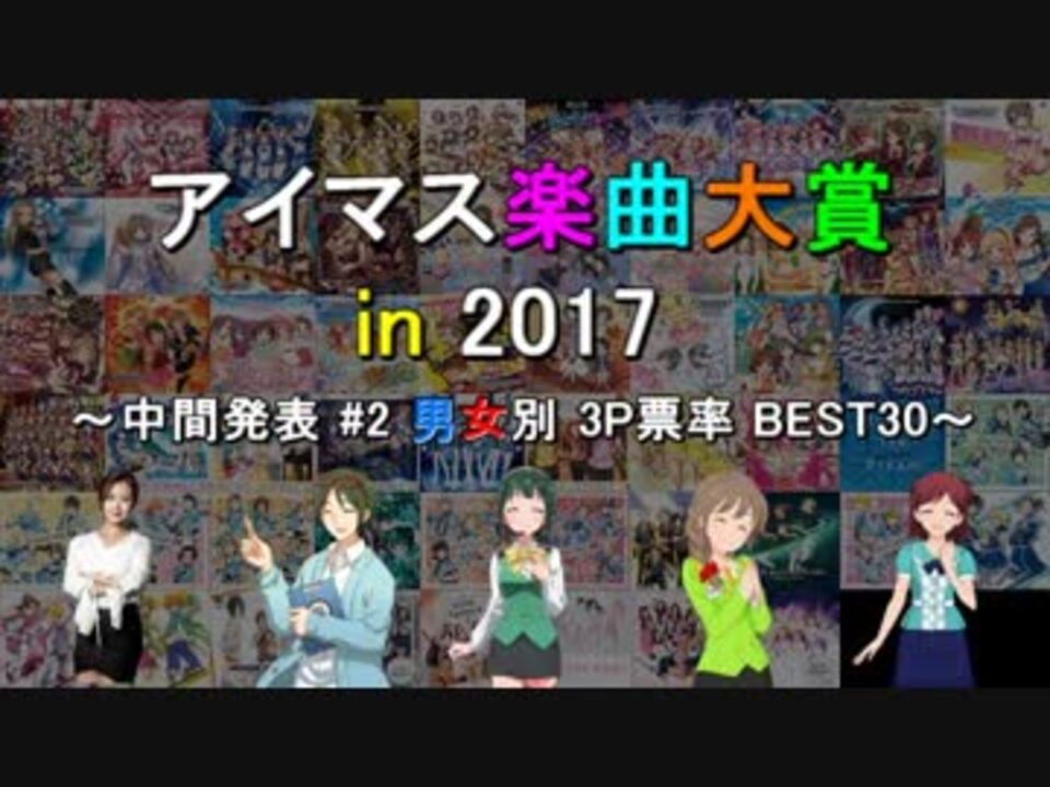 2017年にFull音源版が発売 or 配信されたアイマス関連の楽曲(148曲)に対する人気投票の<br />中間発表2回目です。参加者<font color="red">1500名</font>の段階の結果から<font color="blue">男女別の3P票率</font>BEST30をご紹介<br />します(1/16:参加者約3300名)。<br /><br />★最終結果はこちらから→<a href="https://www.nicovideo.jp/watch/sm32768106" class="watch">sm32768106</a><br /><br />・投票対象曲一覧:<a href="https://ch.nicovideo.jp/article/ar1389125" target="_blank" rel="noopener">ar1389125</a><br />○告知動画:<a href="https://www.nicovideo.jp/watch/sm32515605" class="watch">sm32515605</a><br />○中間1回目:<a href="https://www.nicovideo.jp/watch/sm32554349" class="watch">sm32554349</a><br />○中間3回目:<a href="https://www.nicovideo.jp/watch/sm32654195" class="watch">sm32654195</a><br />●アイマス楽曲大賞 in 2016:<a href="https://www.nicovideo.jp/watch/sm30676427" class="watch">sm30676427</a><br />●『アイマス楽曲ランキングシリーズ』:<a href="https://www.nicovideo.jp/mylist/57911966" target="_blank" rel="noopener">mylist/57911966</a>