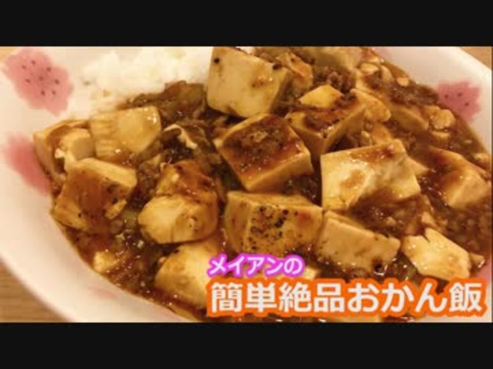 実況界のお母さんと最近呼ばれているような気がします。メイアンです。<br />簡単に作れる、おしゃれじゃないけど美味しいごはんを動画にしていく予定です!<br />こんなの作ってほしい、というリクエストありましたら、コメントでぜひ!<br /><br />今回は、『麻婆豆腐』です。<br />豆板醬、甜麵醬、にんにくしょうががあれば、<br />豆腐とネギとひき肉でできてコスパ高いのでおススメです(´ω`)<br />今回の材料は2人前となっております。<br /><br />メイアンおかん飯マイリス⇒<a href="https://www.nicovideo.jp/mylist/60833221" target="_blank" rel="noopener">mylist/60833221</a><br /><br />実況part1まとめ⇒<a href="https://www.nicovideo.jp/mylist/58641035" target="_blank" rel="noopener">mylist/58641035</a><br />歌ってみたまとめ⇒<a href="https://www.nicovideo.jp/mylist/18048303" target="_blank" rel="noopener">mylist/18048303</a><br />メイアンこみゅにてぃ⇒co112548<br />