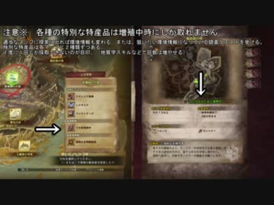 ようやく全種類みつけたので、攻略動画にしました。<br />各マップに2種類ずつある特別な特産品の場所と道順です。<br />環境情報で増殖中でさえすれば、下位でも上位でも出ます。<br /><br /><br />投稿動画:<a href="https://www.nicovideo.jp/mylist/60924855" target="_blank" rel="noopener">mylist/60924855</a><br /><br /><br />古代樹の森 百陽草<a href="#" class="seekTime" data-seekTime="0:10" onclick="seekNicoPlayer('#0:10'); return false;">#0:10</a> 月夜茸<a href="#" class="seekTime" data-seekTime="0:51" onclick="seekNicoPlayer('#0:51'); return false;">#0:51</a><br />大蟻塚の荒地 ドラゴンフラワー<a href="#" class="seekTime" data-seekTime="1:52" onclick="seekNicoPlayer('#1:52'); return false;">#1:52</a> トロピカパイン<a href="#" class="seekTime" data-seekTime="3:10" onclick="seekNicoPlayer('#3:10'); return false;">#3:10</a><br />陸珊瑚の台地 藤色ツボアワビ<a href="#" class="seekTime" data-seekTime="3:48" onclick="seekNicoPlayer('#3:48'); return false;">#3:48</a> プラチナパール<a href="#" class="seekTime" data-seekTime="4:53" onclick="seekNicoPlayer('#4:53'); return false;">#4:53</a><br />瘴気の谷 魔の化石<a href="#" class="seekTime" data-seekTime="6:09" onclick="seekNicoPlayer('#6:09'); return false;">#6:09</a> ヘブンベリー<a href="#" class="seekTime" data-seekTime="6:53" onclick="seekNicoPlayer('#6:53'); return false;">#6:53</a><br />龍結晶の地 ノアストーン<a href="#" class="seekTime" data-seekTime="8:00" onclick="seekNicoPlayer('#8:00'); return false;">#8:00</a> 黄昏の石<a href="#" class="seekTime" data-seekTime="8:39" onclick="seekNicoPlayer('#8:39'); return false;">#8:39</a><br />