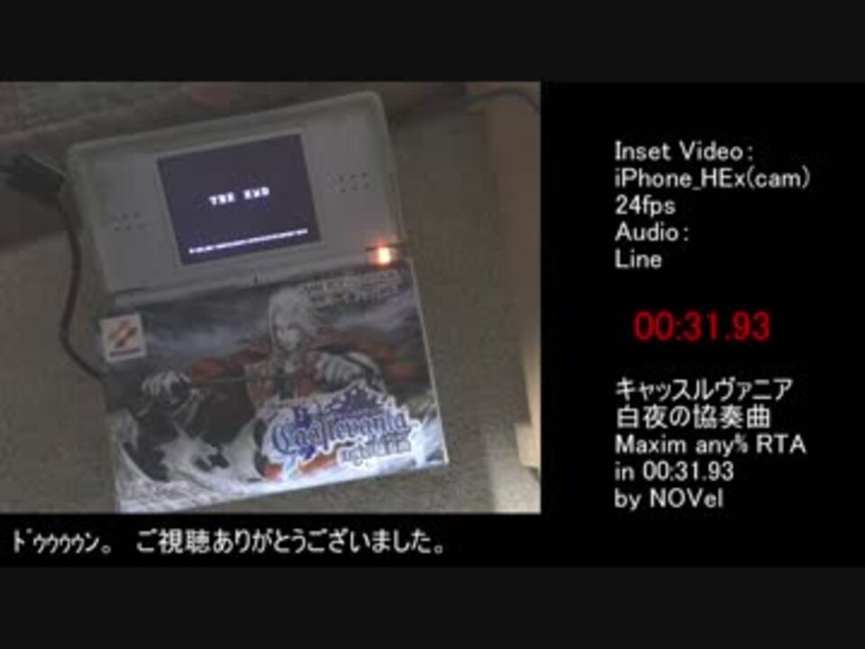 <font size="5"><font color="red">speedrun.comにsubmitしました→<a href="https://www.speedrun.com/cvhod/run/y8qo34xy" target="_blank" rel="noopener nofollow">https://www.speedrun.com/cvhod/run/y8qo34xy</a></font></font><br />白夜の協奏曲マクシームモードのany%RTAです。Nintendo DS Lite直撮り(ボタンが見切れて申し訳ない)です。<br />世界記録をちょっとだけ更新しました。<br />人類初の32秒切りを達成しました。<br /><br />RTA:<a href="https://www.nicovideo.jp/mylist/59766092" target="_blank" rel="noopener">mylist/59766092</a><br />格闘縛り:<a href="https://www.nicovideo.jp/mylist/59631247" target="_blank" rel="noopener">mylist/59631247</a><br />YouTube版:<a href="https://youtu.be/-_iMfVrmaKg" target="_blank" rel="noopener nofollow">https://youtu.be/-_iMfVrmaKg</a><br /><br />追伸:Wii U VCも実機ですので誤解のないようにおねがいします。<br />コメント・広告ありがとうございます!