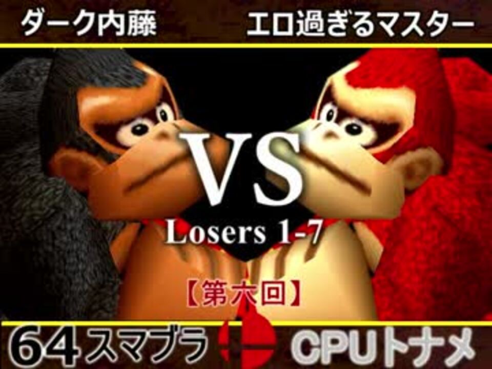 動物園<br /><u>※どちらが勝つかアンケ結果(Twitter調べ)</u><br />ダーク内藤(DK) 29% VS エロ過ぎるマスター(DK) 71%<br /><br />【大会形式】ダブルイリミネーション方式トーナメント<br />・一度負けてもルーザーズ側を勝ち続ければ決勝に行ける<br /><br /><font color="#0000ff"><u>※64スマブラCPUトナメ実況のwikiができた模様</u>→</font> <a href="https://wiki3.jp/cpu_64" target="_blank" rel="noopener nofollow">https://wiki3.jp/cpu_64</a><br /><br /><b><font size="5"><font color="#ff0000">次→</font></font></b>【<a href="https://www.nicovideo.jp/watch/sm32741590" class="watch">sm32741590</a>】<br /><br />前【<a href="https://www.nicovideo.jp/watch/sm32732451" class="watch">sm32732451</a>】 一回戦第一試合【<a href="https://www.nicovideo.jp/watch/sm32538745" class="watch">sm32538745</a>】<br /><br />第六回マイリスト【<a href="https://www.nicovideo.jp/mylist/60846974" target="_blank" rel="noopener">mylist/60846974</a>】<br />64スマブラCPUトナメ実況part1まとめ【<a href="https://www.nicovideo.jp/mylist/60846861" target="_blank" rel="noopener">mylist/60846861</a>】<br />その他シリーズ【<a href="https://www.nicovideo.jp/mylist/12965027" target="_blank" rel="noopener">mylist/12965027</a>】<br /><br /><b><font color="#00bfff">Twitter</font></b>【@niconicopppppp】<br /><b><font color="#ff4500">チャンネル</font></b>【<a href="https://ch.nicovideo.jp/p-desu" target="_blank" rel="noopener">ch.nicovideo.jp/p-desu</a>】